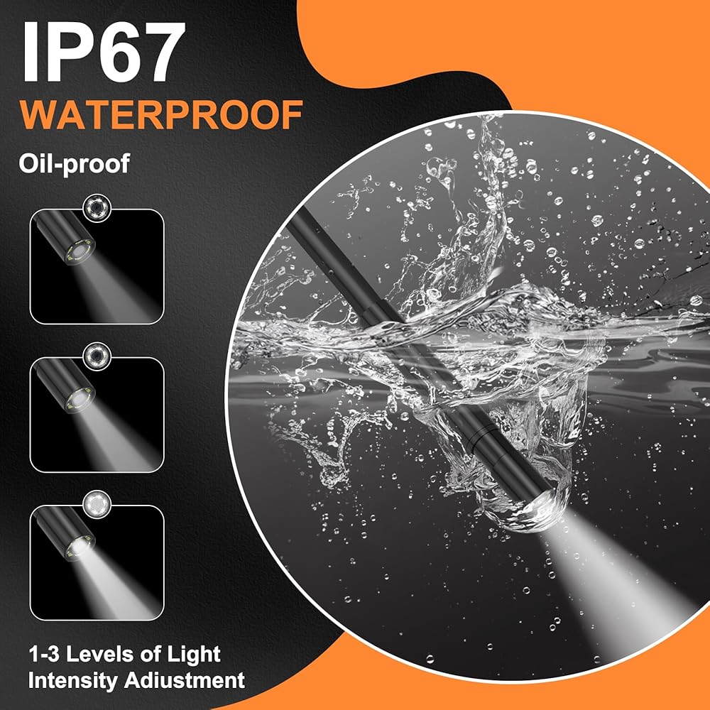 [عدسة مقاومة للماء مقاس 5.5 ملم - نحيفة ومتينة] مصممة بعدسة IP67 مقاومة للماء مقاس 5.5 ملم، تعمل كاميرا بوريسكوب هذه بشكل موثوق في البيئات الرطبة أو الزيتية أو المحصورة. إنها أداة أساسية لفحص المصارف المسدودة وقنوات التدفئة والتهوية وتكييف الهواء والمزيد.
