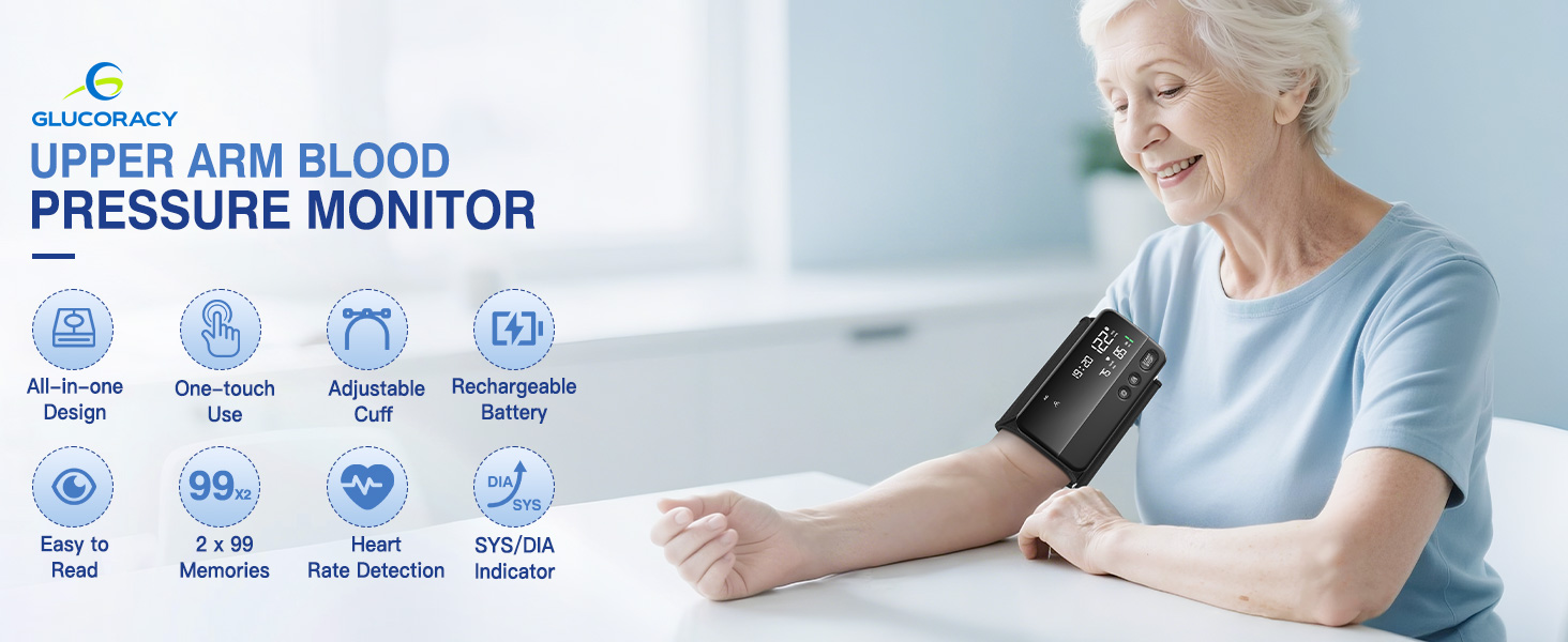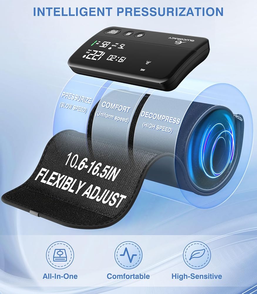 Glucoracy Upper Arm Blood Pressure Monitor, Rechargeable Blood Pressure Machine, Blood Pressure Monitors for Home Use, Portable One-Piece Design, Adjustable Wide Range Arm 10.6"-16.5", Large Display