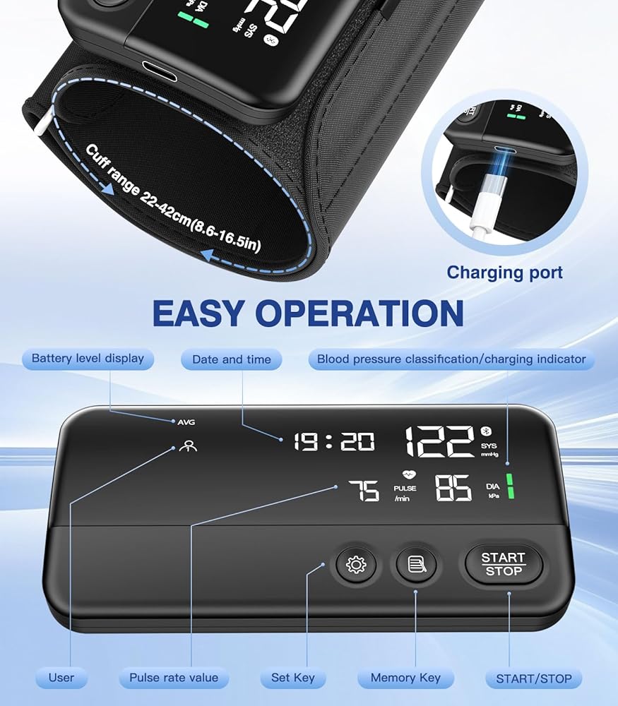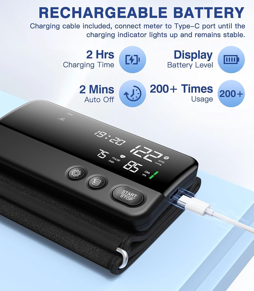 Rechargeable Use: Automatic blood pressure monitor is equipped with large long-endurance battery, which can be used 200+ times after 2 hours of charging, and will automatically shut down without any operation within 2 minutes, saving energy and providing a longer service life.