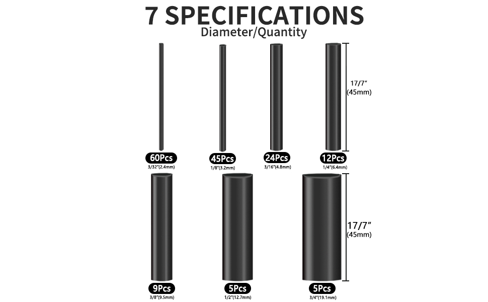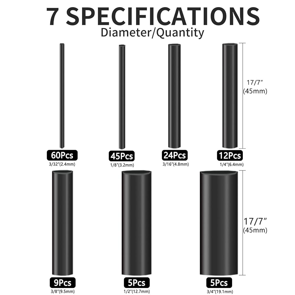 حزمة القيمة النهائية: 150 قطعة في 7 أحجام! :تتضمن هذه المجموعة 150 قطعة مقطوعة مسبقًا (1.77 بوصة لكل منها) في 7 أقطار شائعة: 3/32 بوصة (60 قطعة)، 1/8 بوصة (43 قطعة)، 3/16 بوصة (20 قطعة)، 1/4 بوصة (11 قطعة)، 3/8 بوصة (8 قطع)، 1/2 بوصة (4 قطع)، 3/4 بوصة (4 قطع)، يمكنك التعامل مع أي مشروع أسلاك بكفاءة.