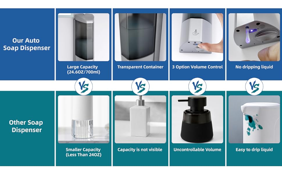 موزع صابون عالي السعة: يمكن لموزع الصابون بدون استخدام اليدين بفتحة واسعة أن يملأ الصابون السائل بسهولة، ويأتي مزودًا بقفل أمان، مما يضيف طبقة إضافية من الأمان. سعة 24.6 أونصة/700 مل أكبر من معظم موزعات الصابون في السوق. تتيح لك الحاوية الشفافة المرئية رؤية مستوى السائل بسهولة. مناسبة لأنواع مختلفة من السوائل.