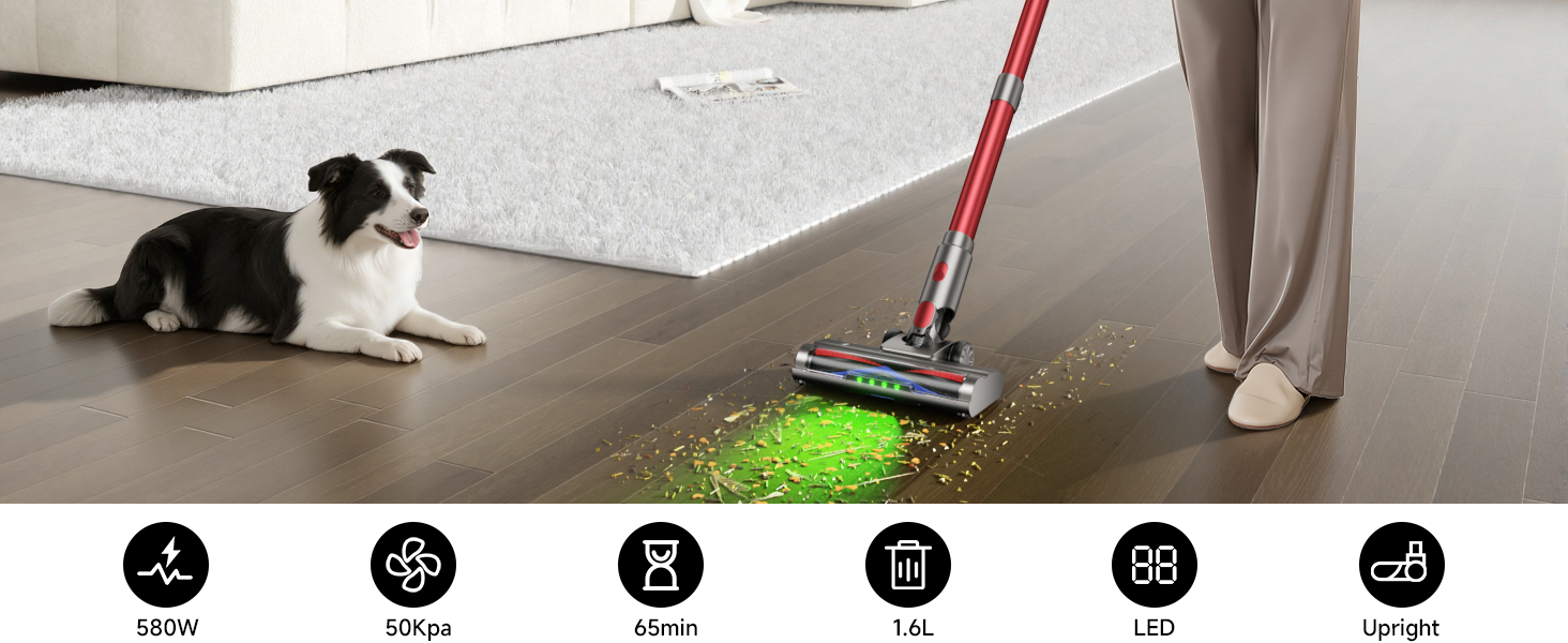 [𝟓𝟎𝐊𝐏𝐚 𝐒𝐮𝐜𝐭𝐢𝐨𝐧 & 𝟓𝟖𝟎𝐖 𝐌𝐨𝐭𝐨𝐫]: تخلص من أرانب الغبار وشعر الحيوانات الأليفة العنيد! بفضل محرك مطور بقدرة 580 واط وشفط بقدرة 50 كيلو باسكال، تعالج المكنسة الكهربائية اللاسلكية Fame Y كل الفوضى - الأرضيات الصلبة، ووسائد الأريكة، وشعر الكلاب على السجاد، والفتات في الزوايا. قم بتنظيف منزلك بالكامل بعمق في 5 دقائق فقط، مما يبقي الحيوانات الأليفة سعيدة ومنزلك نظيفًا.