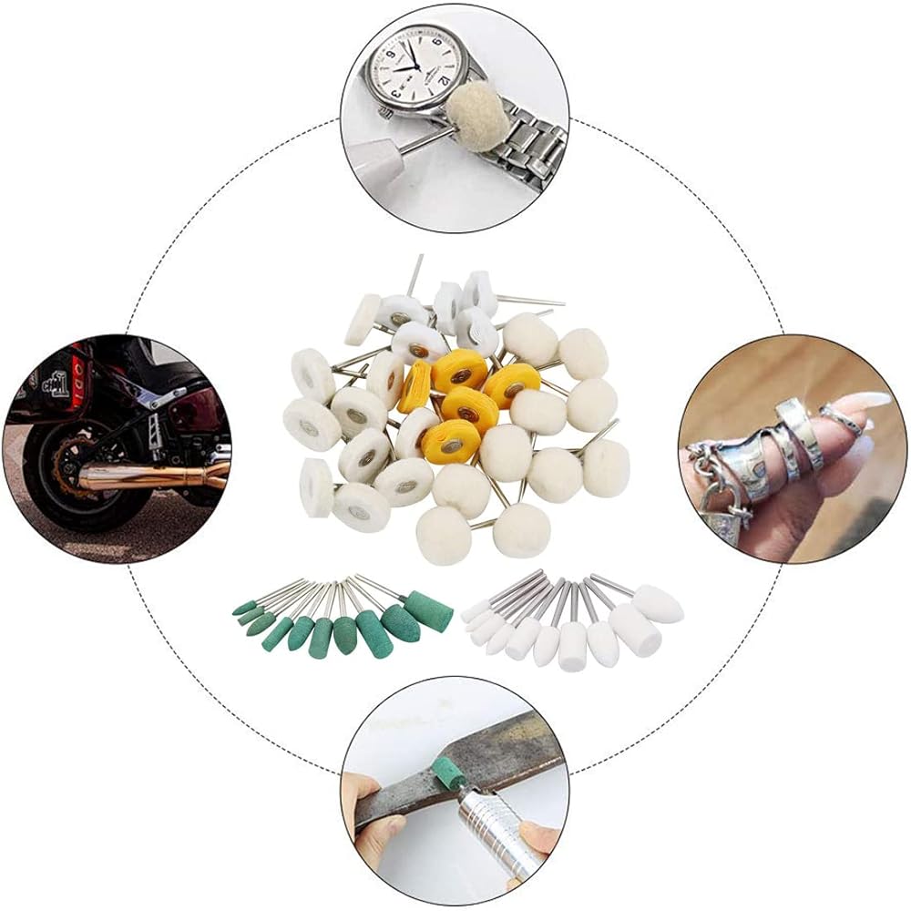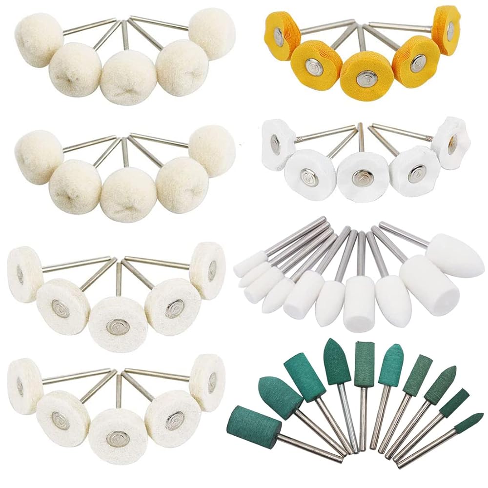 The rubber grinding bits work well for cleaning, rust removing. the soft buffing pads with compound, will polished surface to a brilliant shine.Best used for jewelry, agate, watch, various mould, glass, medical equipment, metal, and many more.