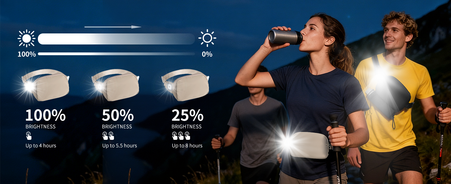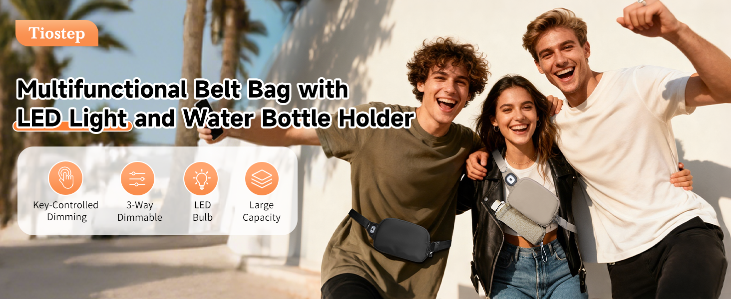 حقيبة حزام مع ضوء LED: تتميز حقيبة الخصر Tiostep بمصباح LED مع ثلاثة مستويات سطوع قابلة للتعديل لتلبية احتياجات الإضاءة المتنوعة الخاصة بك - سواء كنت تقوم بنزهة ليلية، أو تمشية كلبك، أو تجري، أو تعمل بعد حلول الظلام. يتيح تصميمها القابل للفصل سهولة تنظيف الحقيبة وشحن ضوء LED. يوفر ما يصل إلى 5 إلى 8 ساعات من عمر البطارية ومتوافق مع جميع منافذ USB-A للشحن (مثل شواحن USB-A وأجهزة الكمبيوتر المحمولة ومحاور USB وبنوك الطاقة).