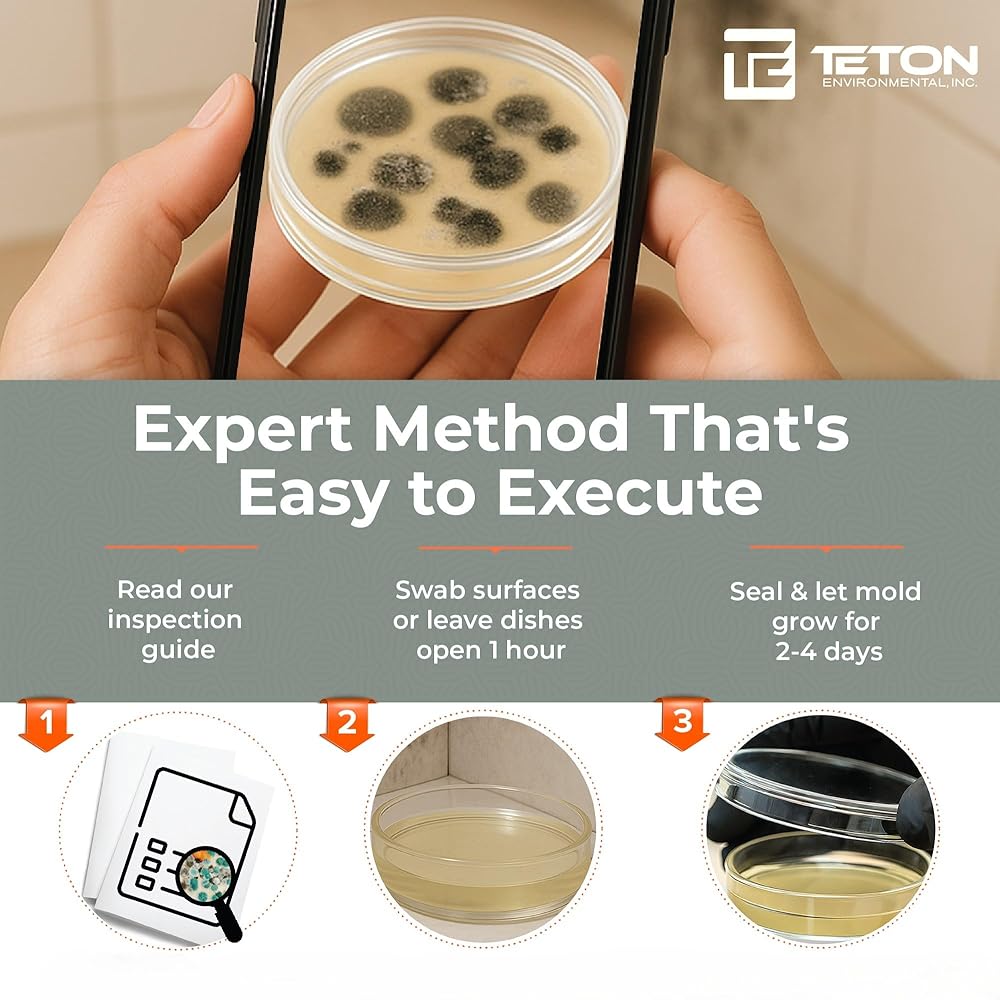 How It Works 1. Inspect: Inspect and find mold. 2. Collect: Use swabs or open petri dishes to sample air or surfaces in high-risk areas. 3. Incubate: Store dishes in a warm, dark place (75-80°F) for 3-7 days.