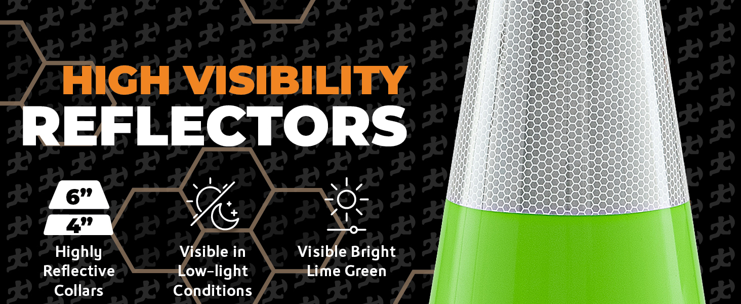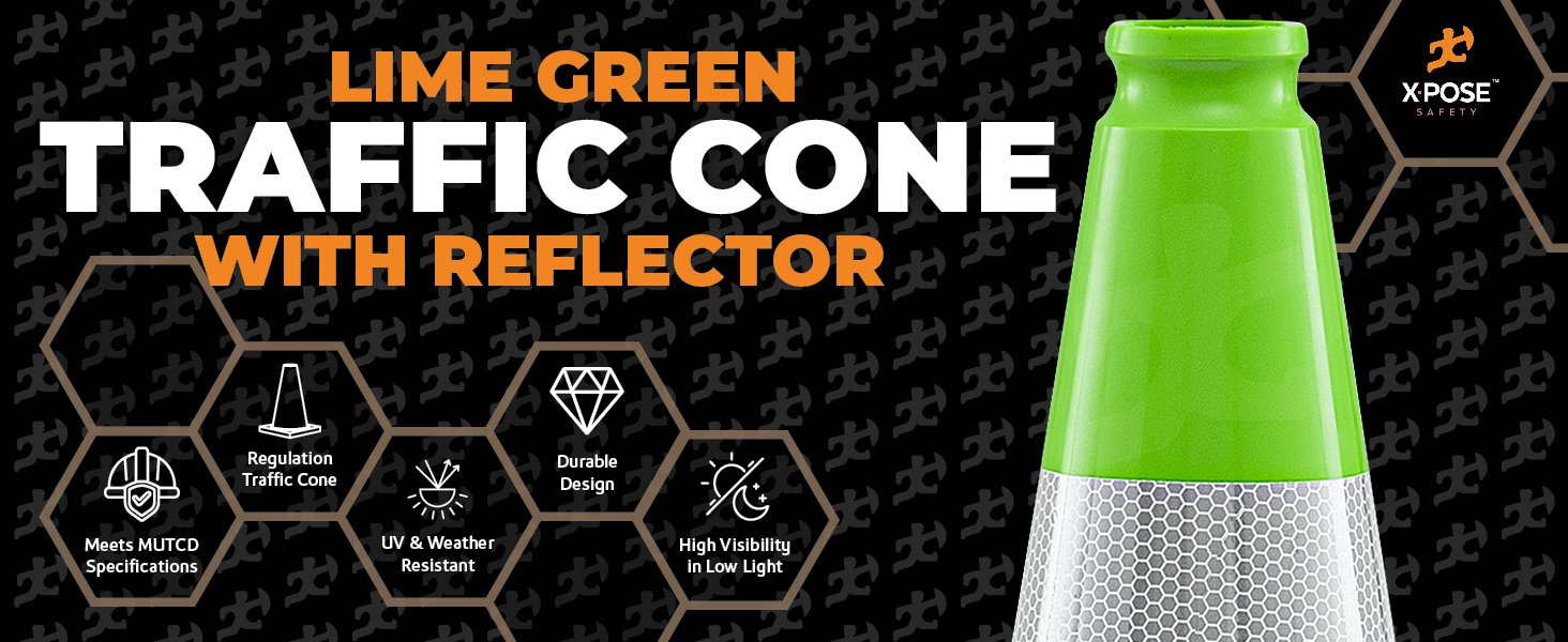 مخروط تنظيم المرور: يحتوي هذا المخروط الأخضر الليموني على شريطين عاكسين، وقاعدة سوداء ويلبي مواصفات MUTCD. استخدمه لتحديد مناطق التحذير أو المركبات المتوقفة أو أي خطر على الطريق. يتم دعم مخاريط الأمان المتينة هذه بواسطة Xpose Safety.