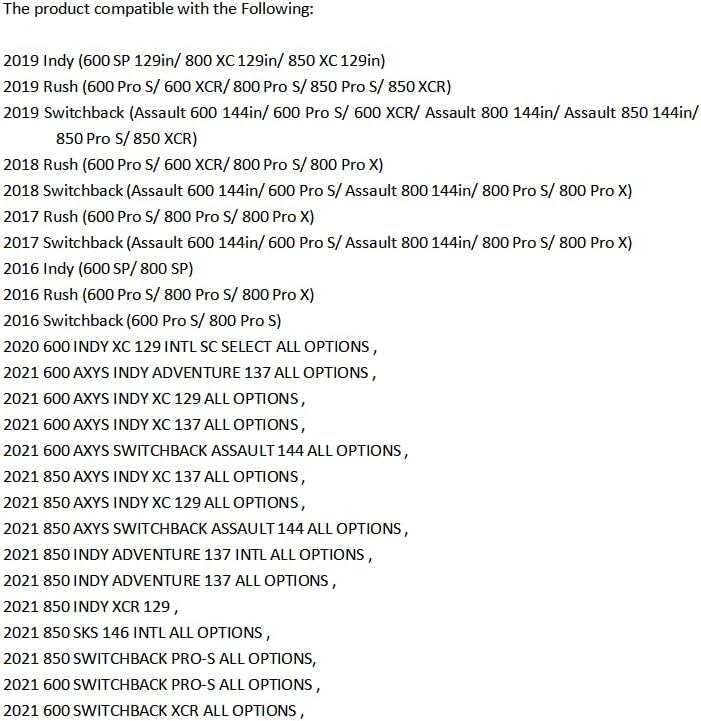 4.Also fits: 2018 Rush /600 Pro S/ 600 XCR/ 800 Pro S/ 800 Pro X/;2018 Switchback /Assault 600 144in/ 600 Pro S/ 800 144in/ 800 Pro S/ 800 Pro X/