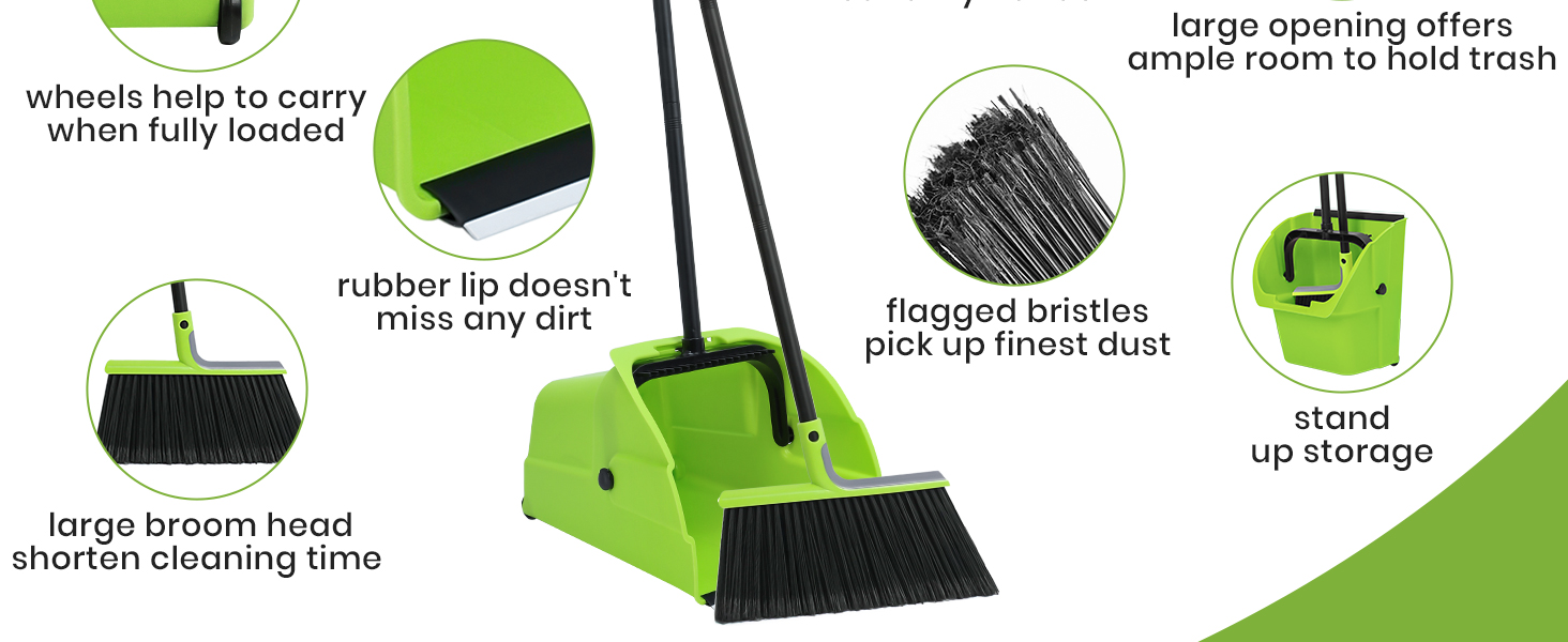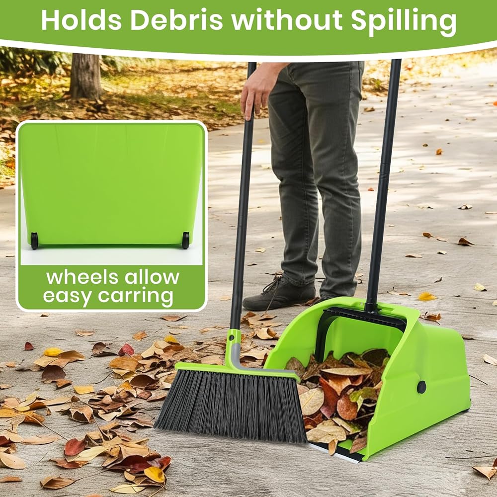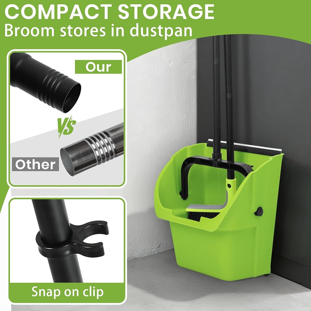 • ☀ مجرفة مع مشط - أسنان مدمجة على طول الجزء العلوي من الوعاء مفيدة لتنظيف مكنستك دون أيدي متسخة. مجموعة المكنسة والمجارف الخارجية مشربة بحماية من الأشعة فوق البنفسجية للاستخدام اليومي. تحتوي مقلاة الغبار الصناعية هذه على عجلات لسهولة الحمل.