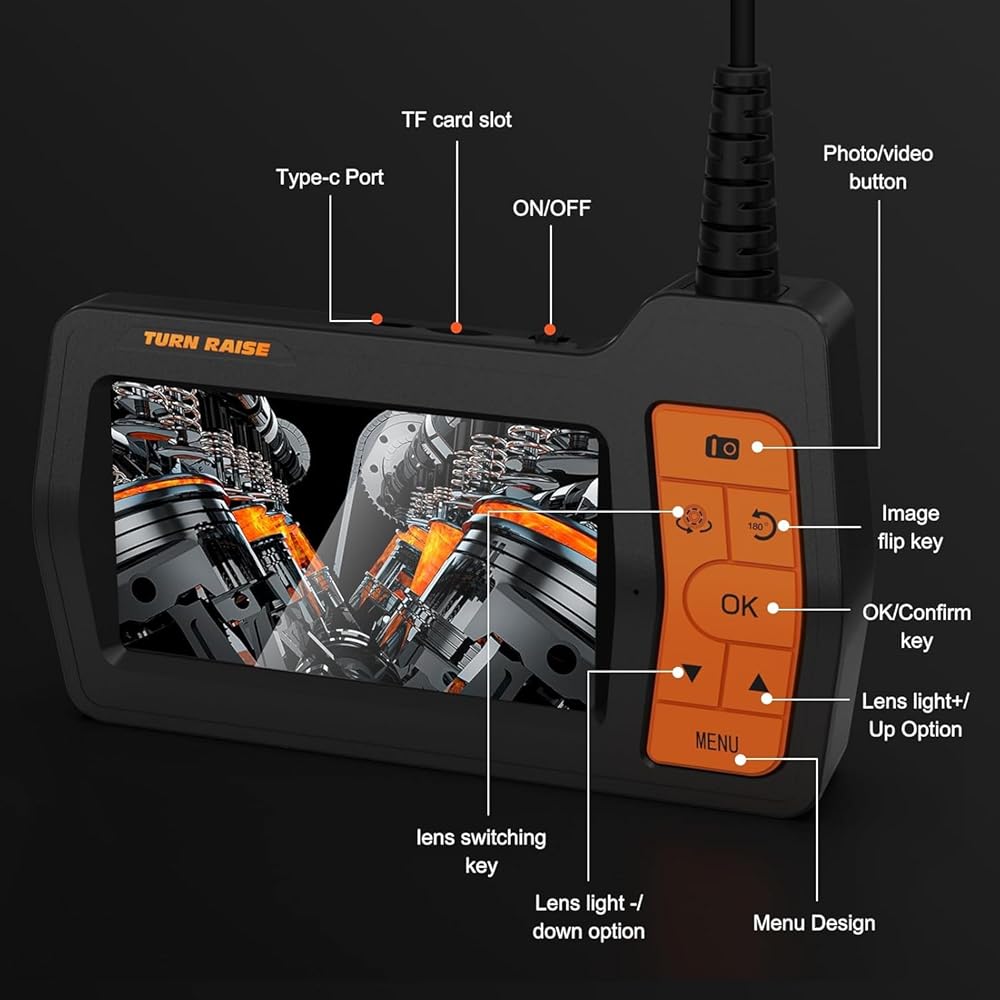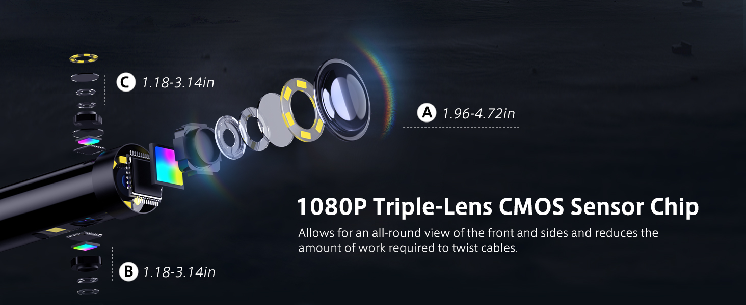 • منظار ثلاثي العدسات مع شاشة مقسمة: يسمح برؤية شاملة للأمام والجوانب ويقلل من مقدار العمل المطلوب لتحريف الكابلات. اضغط مع الاستمرار على زر الوجه بزاوية 180 درجة للتبديل بين 5 أوضاع عرض، والنطاقات البؤرية 1.9-4.7 بوصة (الكاميرا الأمامية A)، و1.2-3.1 بوصة (الكاميرا الجانبية B) و0.8-2.4 بوصة (الكاميرا الجانبية C) تجعل من السهل تشخيص المشكلات الصعبة