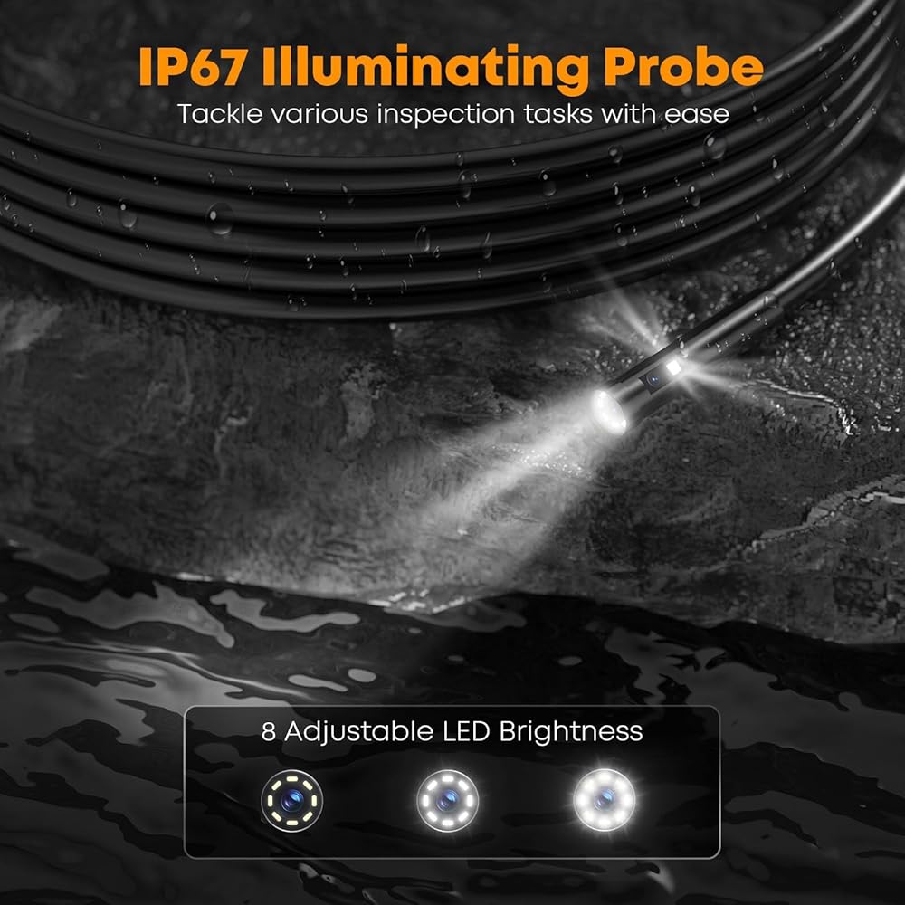 • منظار صناعي متين IP67: مسبار كاميرا الصرف الصحي المقاومة للماء IP67 مع 8+2 خرزات إضاءة LED قابلة للتعديل، والتي يمكنها ضبط سطوع 5 وفقًا للزر، مما يسمح لك بالرؤية بوضوح في ظروف الإضاءة المنخفضة دون وهج أو ظل. تتميز كاميرا الصرف بأنها مقاومة للماء بمعيار IP67 لضمان أنها مناسبة للبيئات القاسية والرطبة