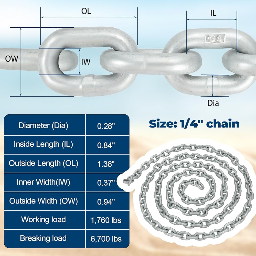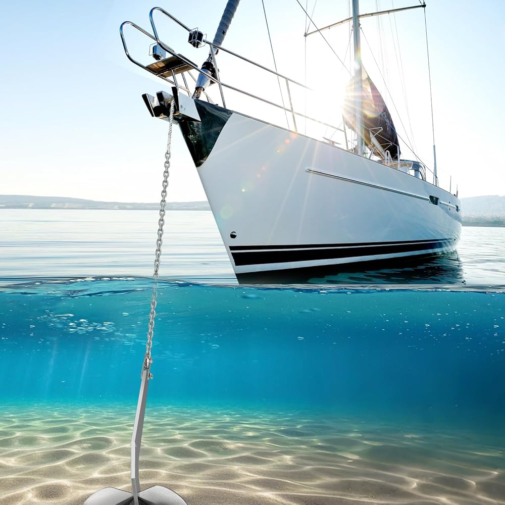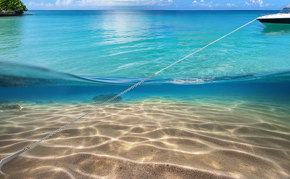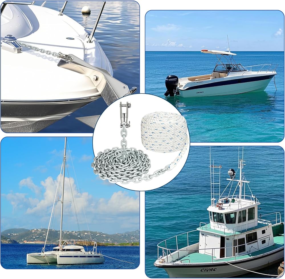 Long-lasting Boat Anchor System:3-strand nylon rope, HT G4 Hot-Dipped Galvanized chain, to guarantee optimum strength and life,galvanized chain substrate is more impact resistant