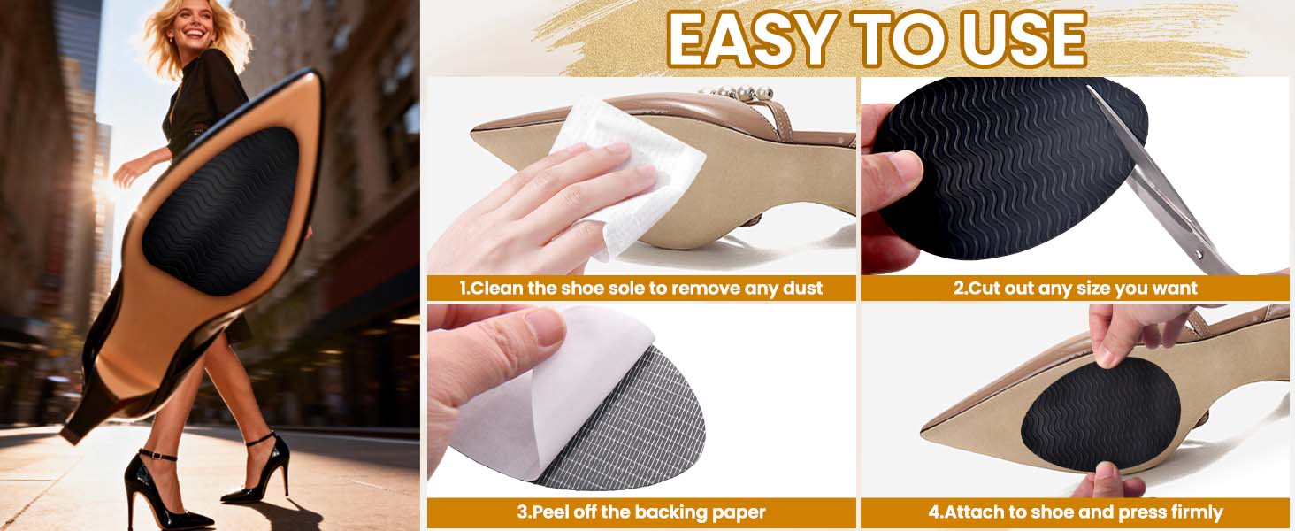 سهل الاستخدام وقابل للتشذيب: ببساطة قم بتنظيف وتجفيف نعل الحذاء، وقشر الطبقة الواقية، واضغط بقوة للالتصاق بشكل آمن. يمكن تشذيبه بسهولة بالمقص ليناسب أي حجم أو شكل حذاء. للحصول على التصاق أفضل في البيئات الباردة، قم بتدفئة الجانب اللاصق بلطف باستخدام مجفف الشعر.