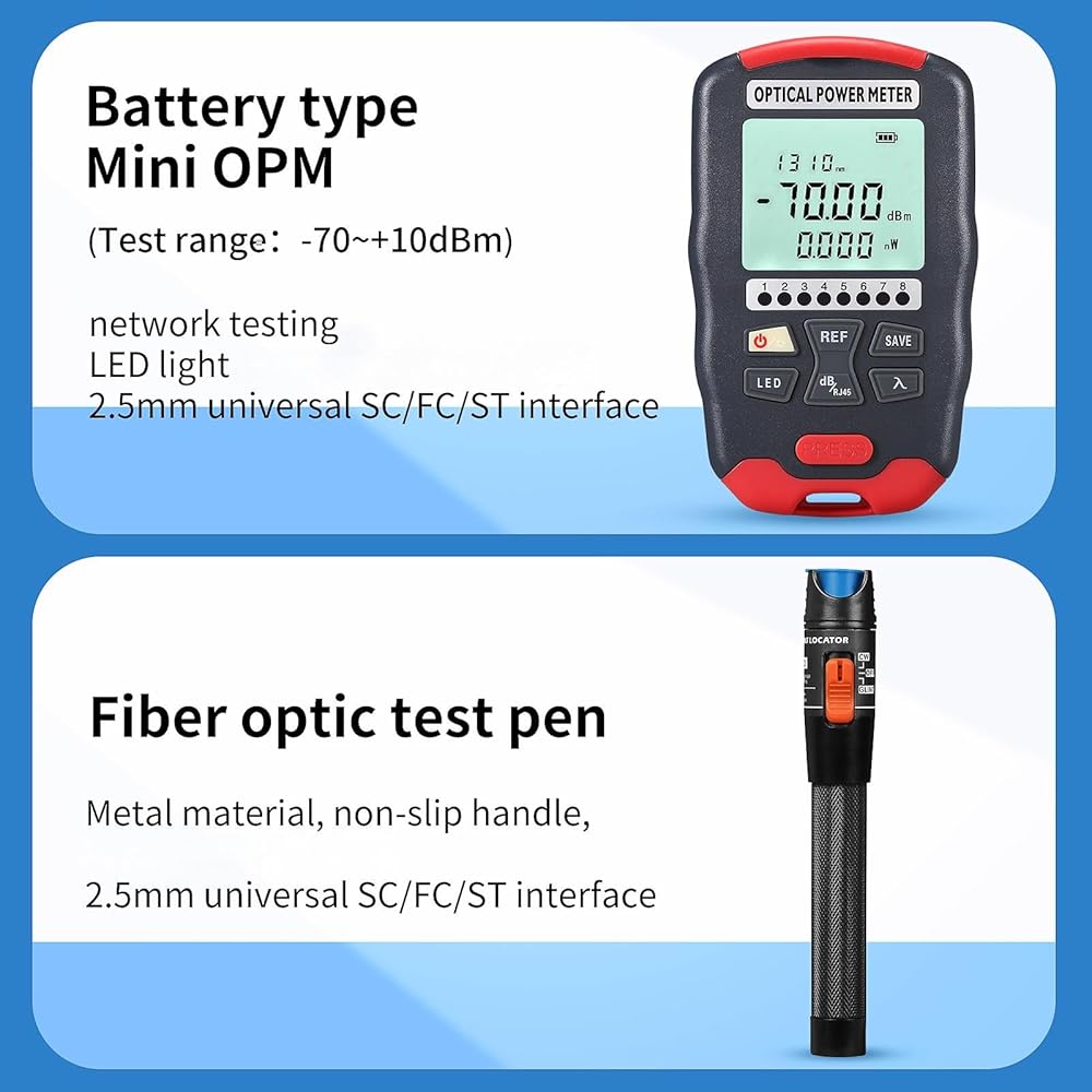 【مقياس طاقة دقيق وقلم اختبار الألياف الضوئية】مجهز بمقياس طاقة بصري يعمل بالبطارية الجافة A-D7 (-70~+10 ديسيبل مللي متر)، يمكنه قياس فقدان ديسيبل ميلي واط بدقة. بالإضافة إلى ذلك، يدعم مقياس الطاقة الضوئية هذا 850 إلى 1650 وهو مجهز بمحول عالمي لموصلات SC/FC/ST. يمكن أن تساعدك أقلام اختبار الألياف الضوئية في التعرف بسرعة على كسور الألياف الضوئية والانحناءات والتحقق من التوصيلات، مما يجعل استكشاف الأخطاء وإصلاحها سريعًا وفعالاً.