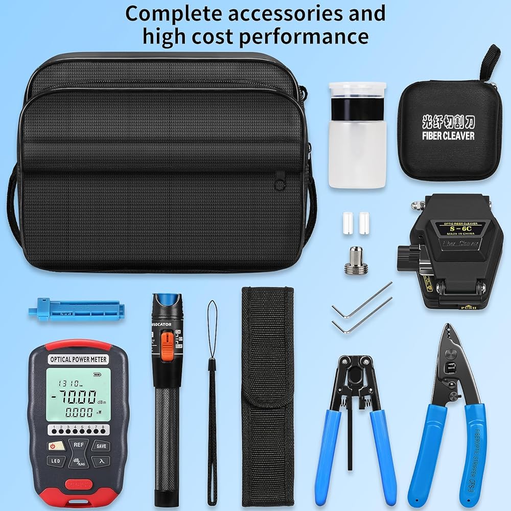 مجموعة أدوات الألياف الضوئية 9 في 1 FTTH مجهزة بقاطع الألياف الضوئية S-6C ومقياس الطاقة الضوئية عالي الدقة D7 (-70~+10dBm) بالإضافة إلى مجموعة أدوات ألياف تقشير الأسلاك