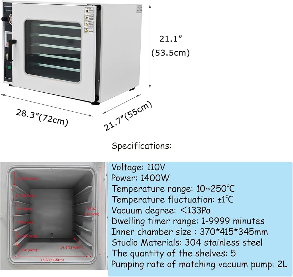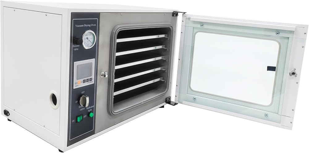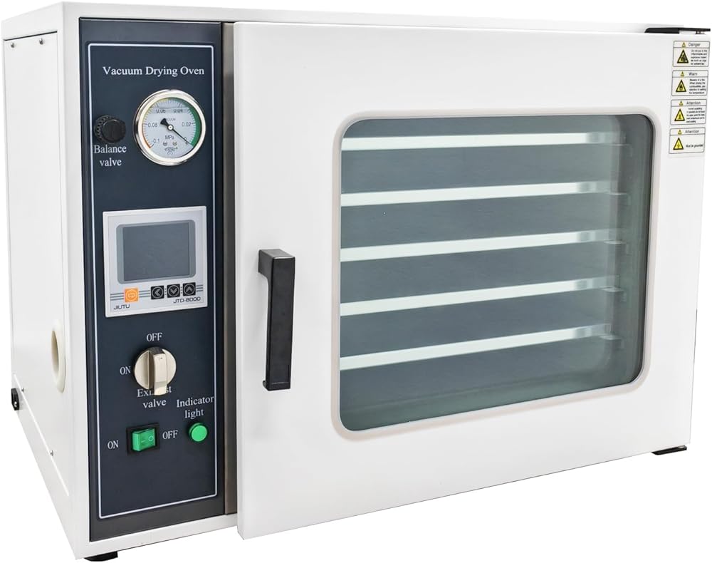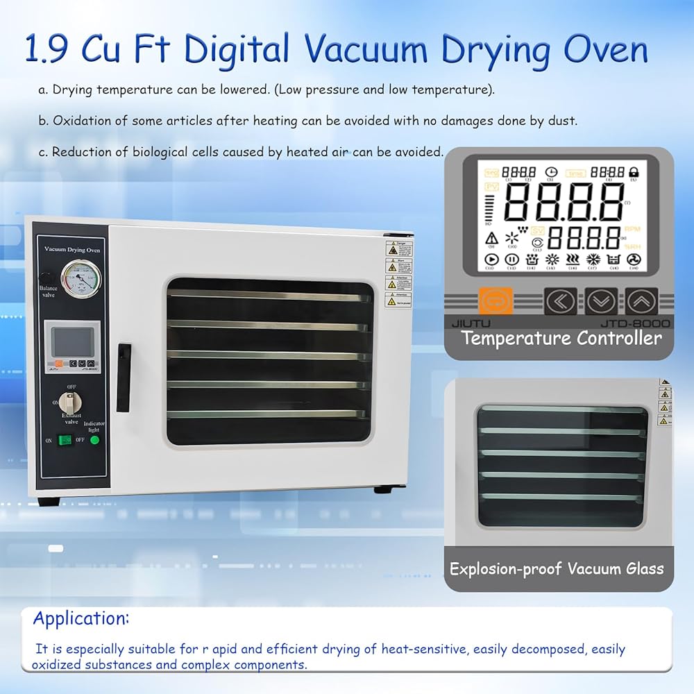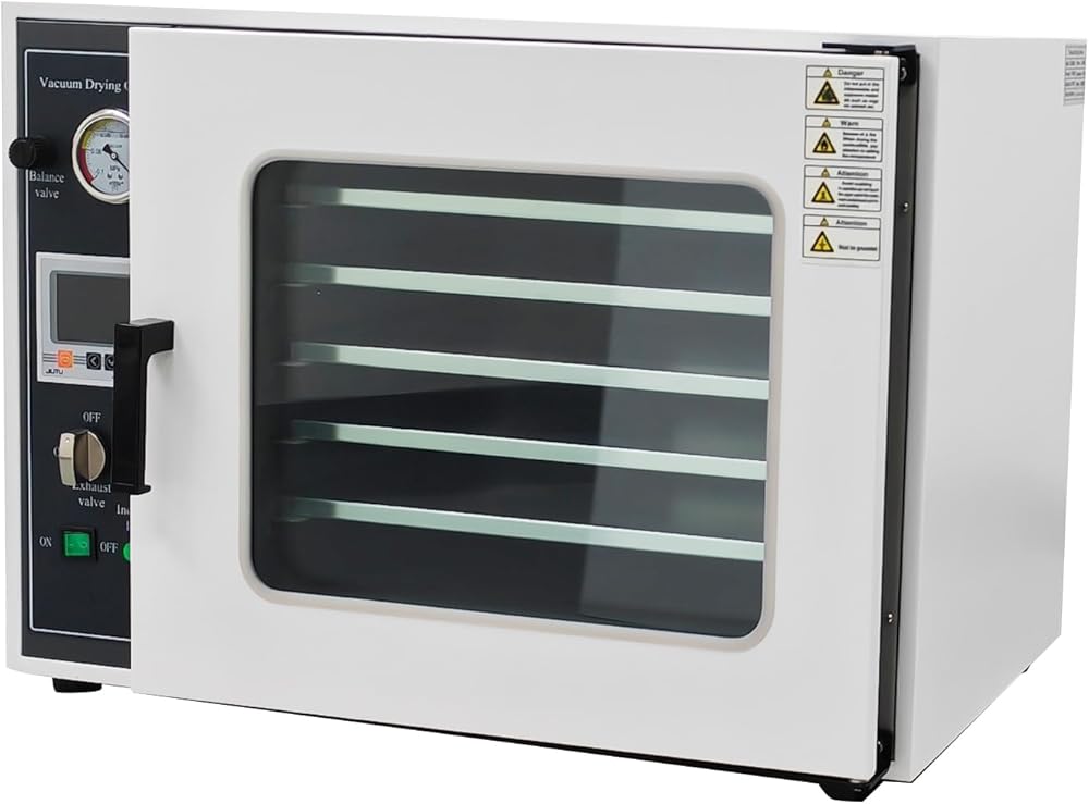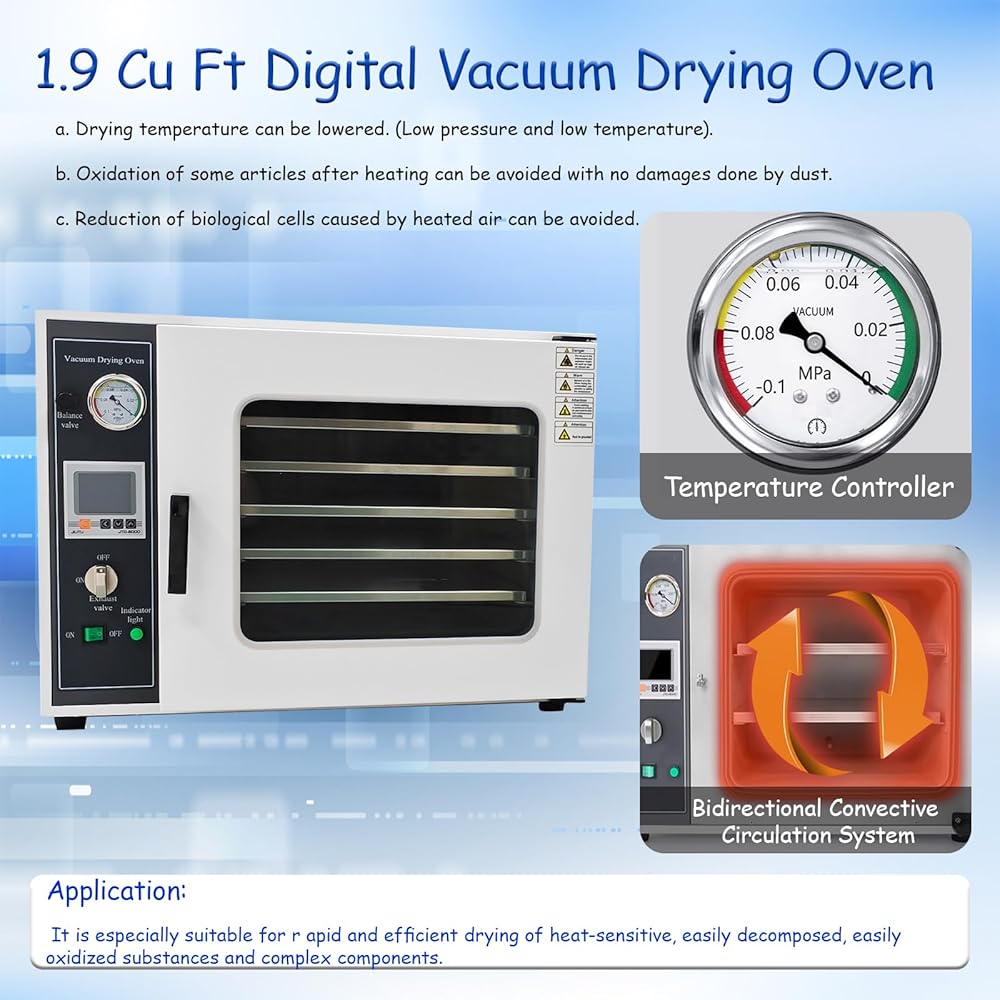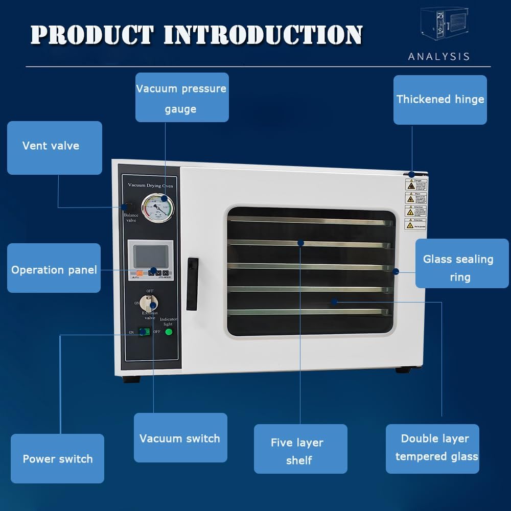 Intelligent Temperature Control: Equipped with LCD backlight display, the vacuum drying oven supports temperature adjustment, timer function, and automatic over-temperature alarm. With a temperature fluctuation range of only ±1℃, the industrial drying lab ensures precise and reliable control throughout the drying process