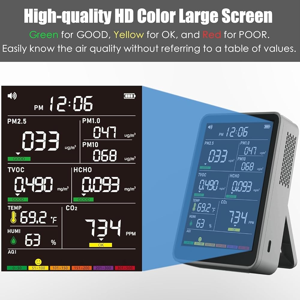 【High-precision Sensor System & HD Large Display】: The high-precision sensor system continuously collects and analyzes air data every 3 seconds, providing you with constant updates on the air quality in your space. A clear and advanced color display enhances readability and adds a touch of sophistication to your environment.