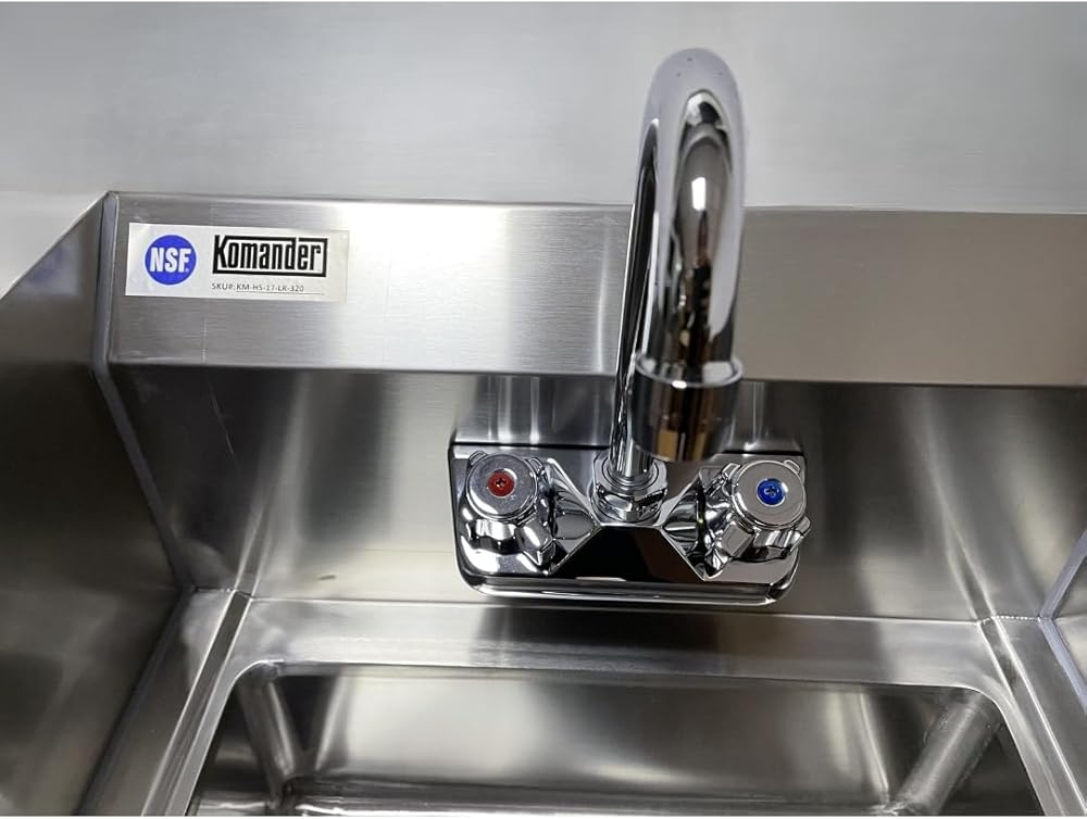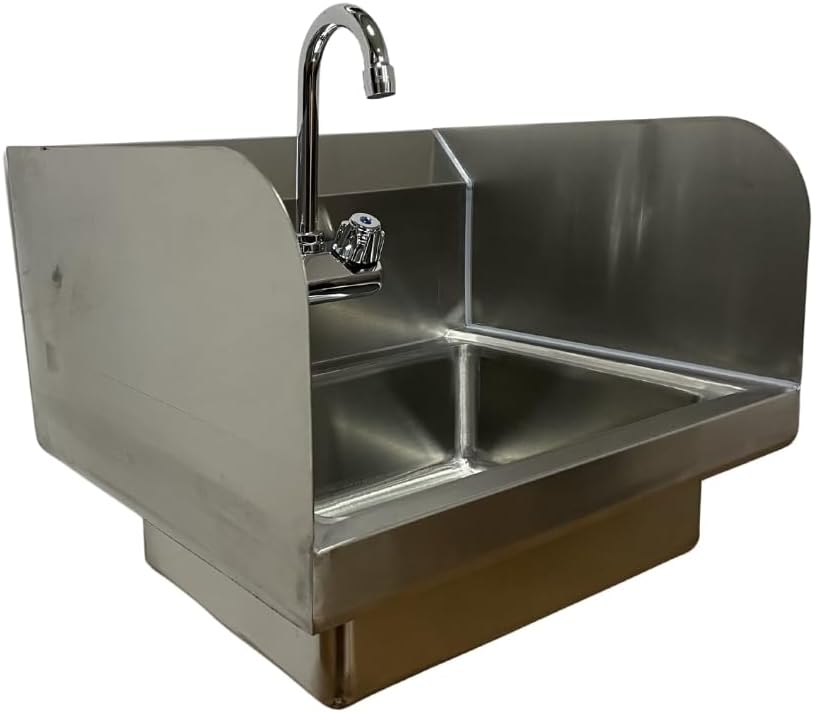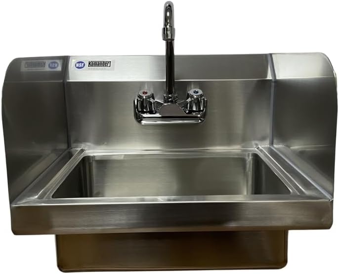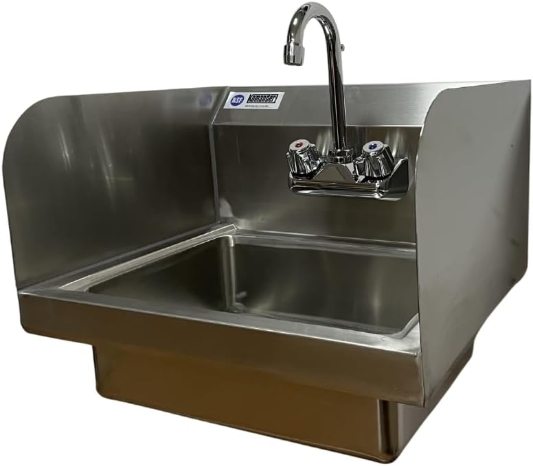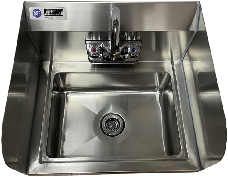 The Komander Stainless Steel Hand Sink with Side Splash (15" x 17" x 13"H) is an NSF-certified, wall-mounted sink designed to enhance hygiene and space efficiency in commercial kitchens and restaurants. Featuring a side splash for added protection, this durable sink ensures easy cleaning and meets health code standards in busy foodservice environments.