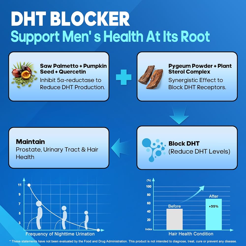 مانع DHT لصحة الشعر: تتميز تركيبتنا المدعومة علميًا بالميتو المنشاري لمنع اختزال 5α، مما يخفض مستويات DHT بشكل مباشر، ويساعد على دعم صحة البروستاتا بشكل عام لدى الرجال وتعزيز صحة الشعر وفروة الرأس.