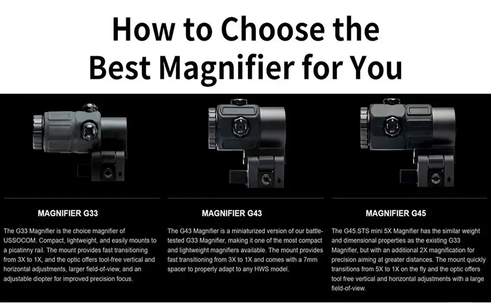 المكبر G45 5X: ترقية متعددة الاستخدامات لتوسيع نطاق أي مشهد نقطة حمراء مع تكبير 5X. الانتقال بسرعة بين سيناريوهات التصوير قصيرة المدى وطويلة المدى.