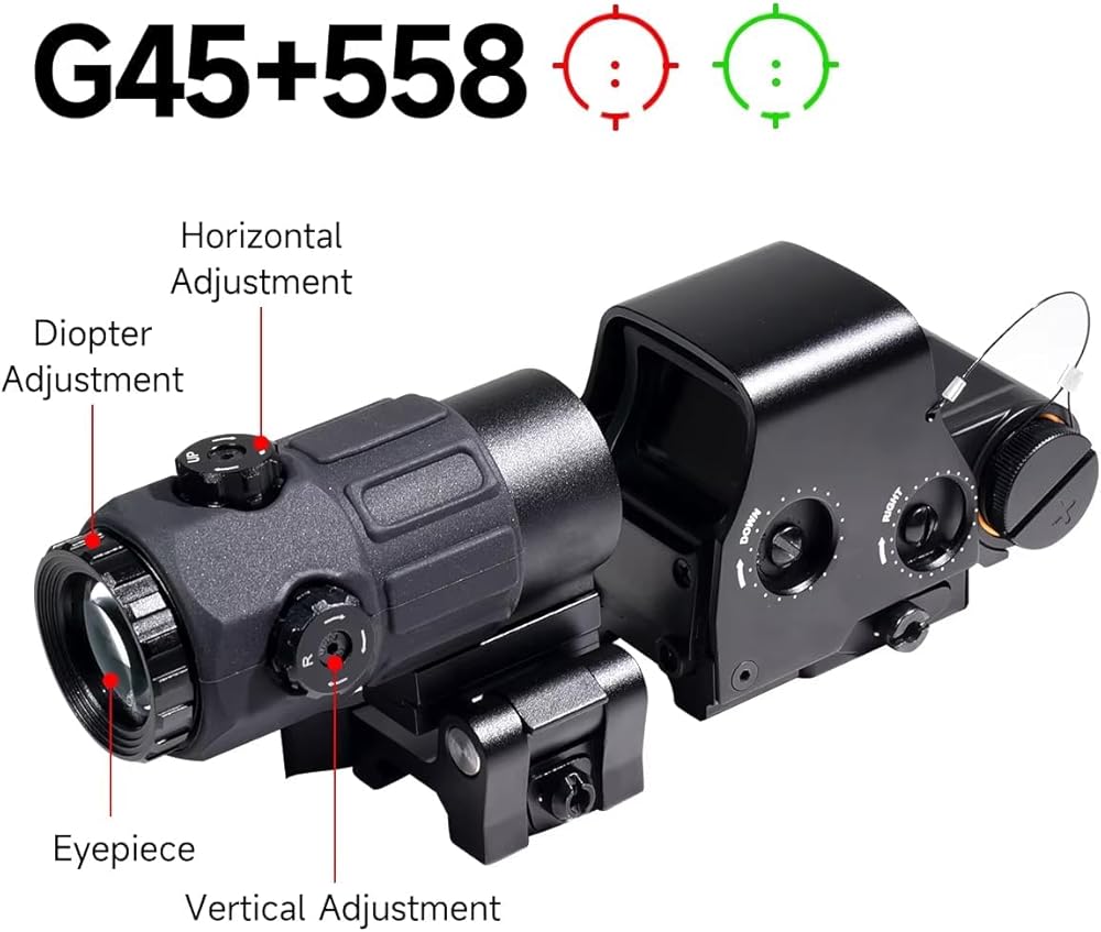 558 G45 جهاز رؤية نقطي أحمر/أخضر ثلاثي الأبعاد: 558 +G45 يحتوي على 10 مستويات لضبط السطوع ويستخدم قاعدة تحرير سريعة للتثبيت والإزالة السريعة.