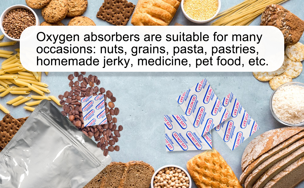 مناسبة للعديد من المناسبات: تُستخدم ممتصات الأكسجين على نطاق واسع في تخزين الطعام في الحياة اليومية. تعتبر ماصات الأكسجين هذه آمنة لوضعها فوق الطعام. لن تضر بالطعام الموجود في مرطبانات ميسون وأكياس مايلر وأكياس المكنسة الكهربائية. ماص الأكسجين مناسب لجميع أنواع الطعام: الملح والسكر والدقيق والمعجنات والحبوب والحبوب الخشنة واللحوم المجففة محلية الصنع والمكسرات وأغذية الحيوانات الأليفة، إلخ.
