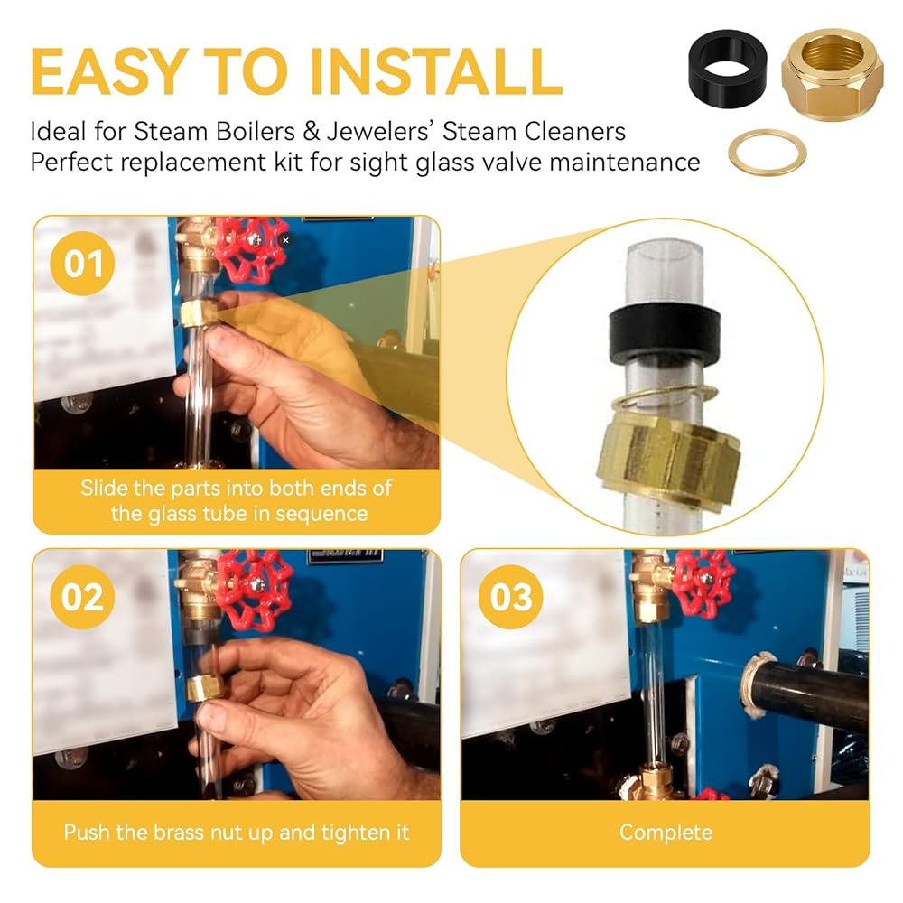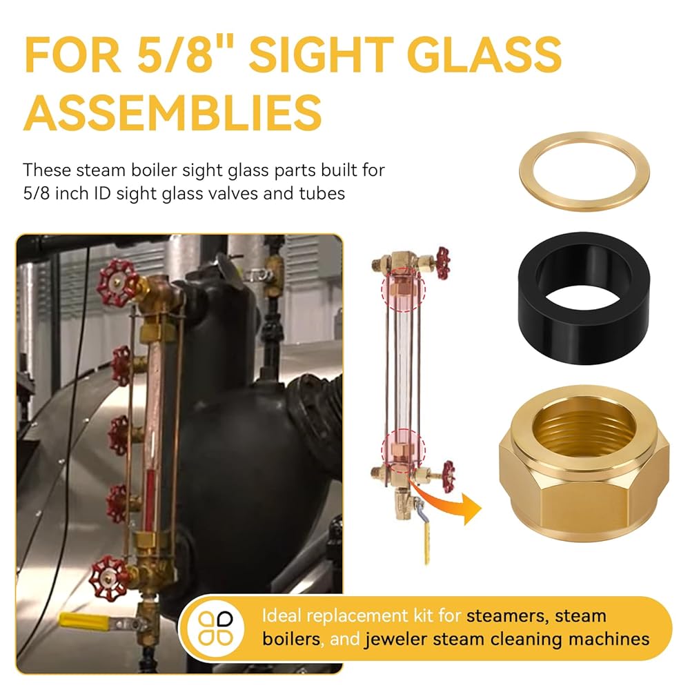 This complete Sight Glass Steamer Repair Kit is designed for 5/8″ ID sight glass systems commonly found in steam boilers, jewelry steam cleaners, and other industrial steam service equipment. Whether you're replacing worn gaskets or performing routine maintenance, this kit provides everything you need for a perfect seal.