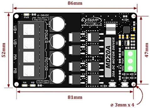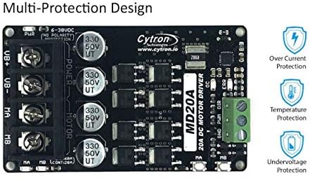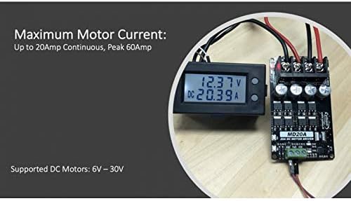 The MD20A enables bidirectional control of one high-power brushed DC motor from 6V to 30V. With discrete NMOS H-Bridge design, this motor driver is able to support 20Amp continuously without any heatsink.