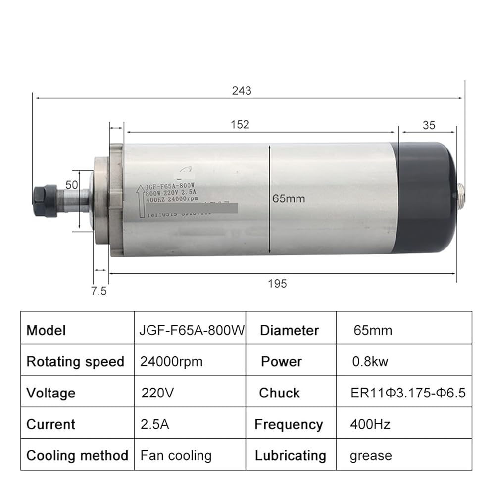 800W 220V air-Cooled Spindle ER11 Chuck Diameter 65mm 4 Bearings JGF-F65A-800W