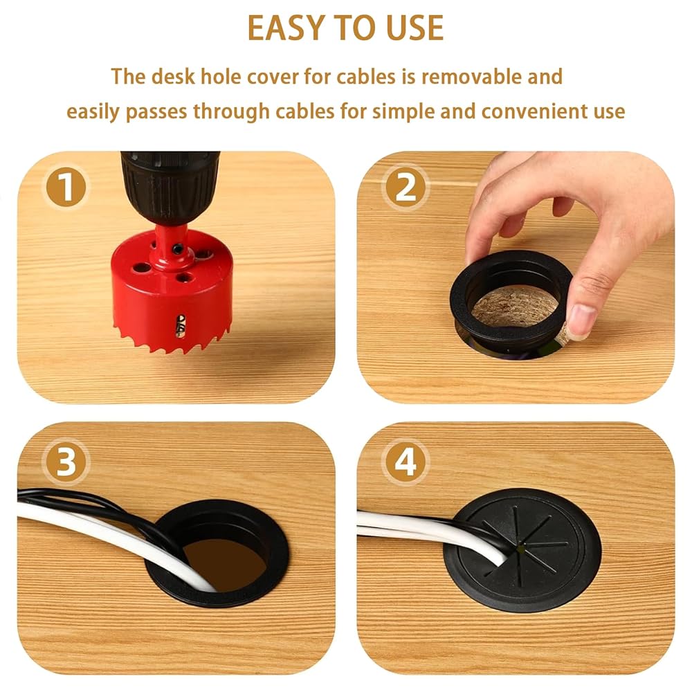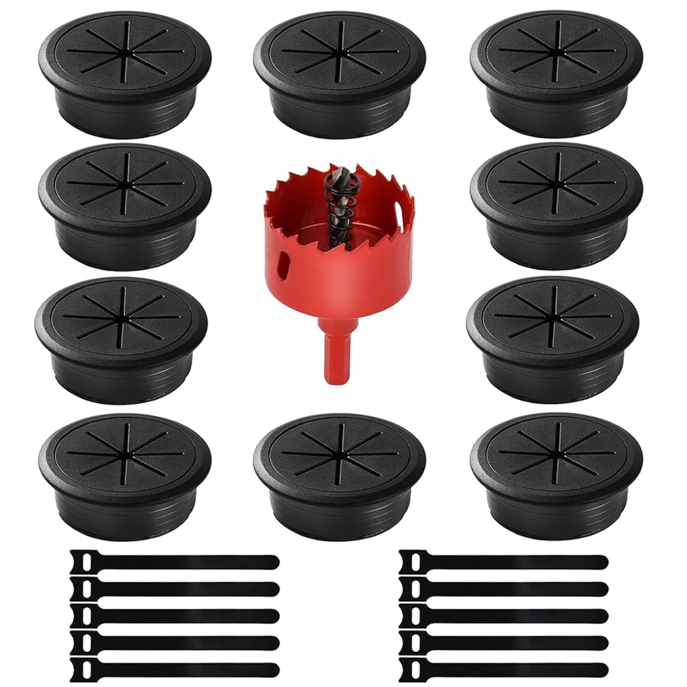 COMPLETE CABLE MANAGEMENT KIT: Get everything you need in one package! Our set includes 10 pieces of premium black 2-inch (50mm) desk grommets AND & 10 Cable Ties a perfectly matched high-speed steel hole saw. Save yourself a trip to the hardware store and start organizing your messy desktop cables immediately.