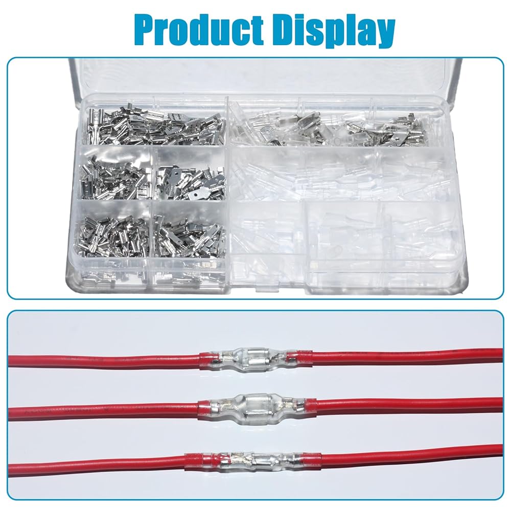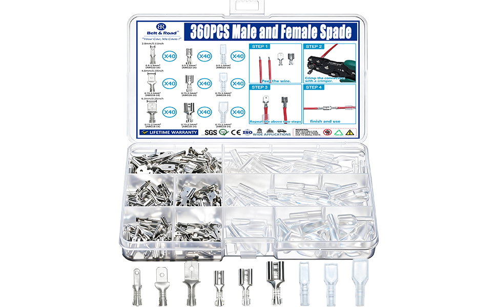 ما الذي ستحصل عليه من هذه العبوة: سوف تحصل على صندوق مكون من 360 قطعة من مجموعة موصلات الأشياء بأسمائها الحقيقية. تتضمن العبوة 40 قطعة 2.8 مم مجموعة موصلات بأسمائها الحقيقية للذكور والإناث، 40 قطعة أكمام عازلة 2.8 مم، 40 قطعة 4.8 مم طقم موصلات بأسمائها الحقيقية للذكور والإناث، 40 قطعة أكمام عازلة 4.8 مم، 40 قطعة 6.3 مم طقم موصلات بأسمائها الحقيقية للذكور والإناث، 40 قطعة أكمام عازلة 6.3 مم.