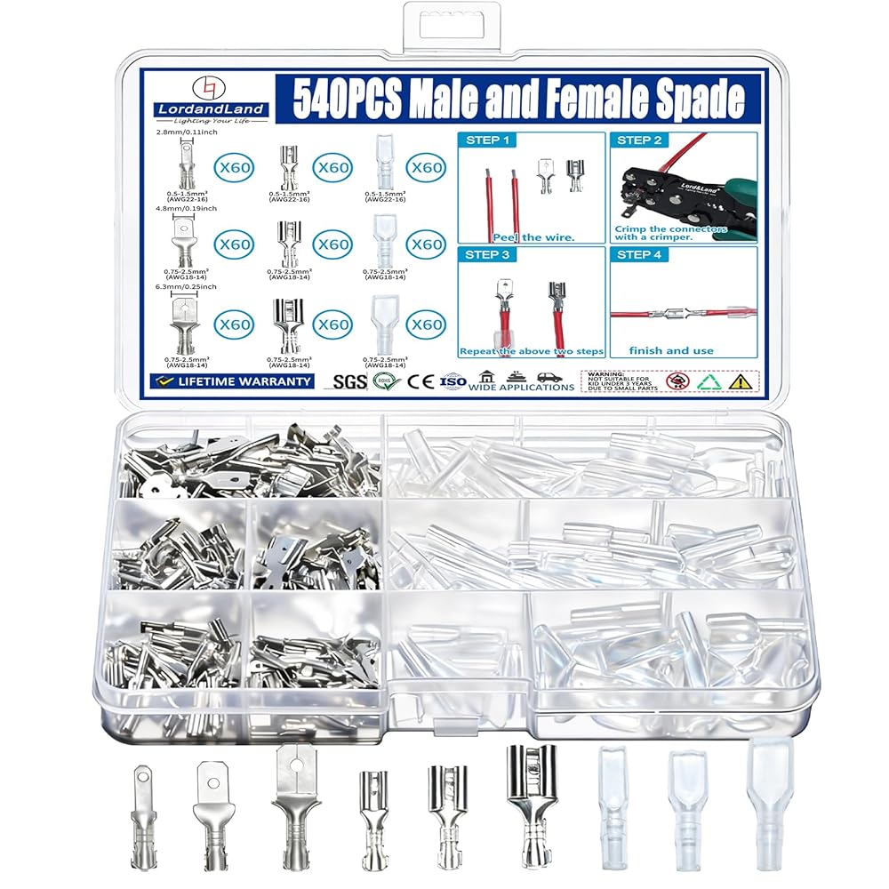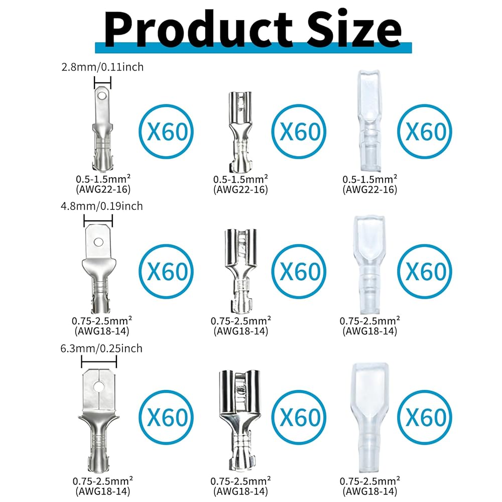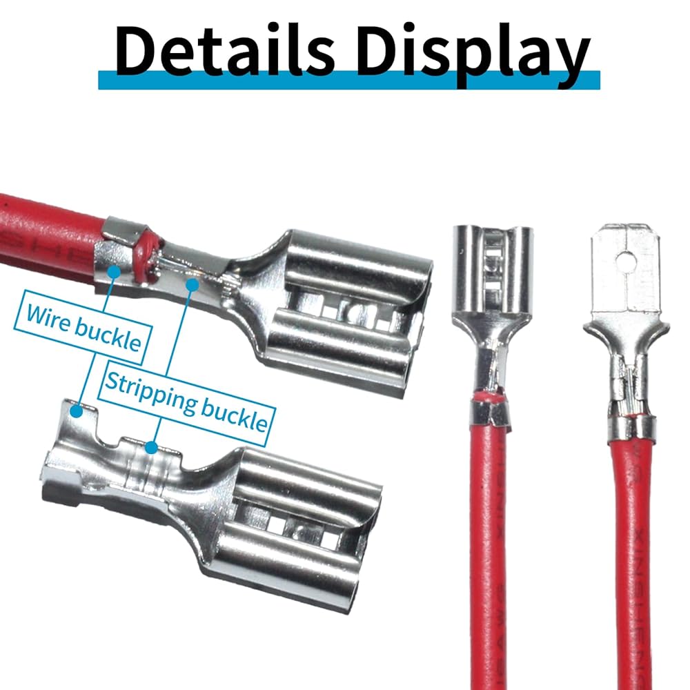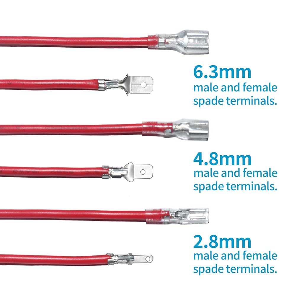 اختر من بين ثلاثة أحجام سهلة الاستخدام (2.8 مم، 4.8 مم، 6.3 مم): تناسب موصلات المجرف الذكور والإناث سلك قياس 22-14، مما يجعلها مثالية لكل شيء بدءًا من إصلاحات السيارات وحتى إعدادات الصوت المنزلية. مهما كانت احتياجاتك من الأسلاك، يوجد هنا الحجم المناسب لهذه المهمة