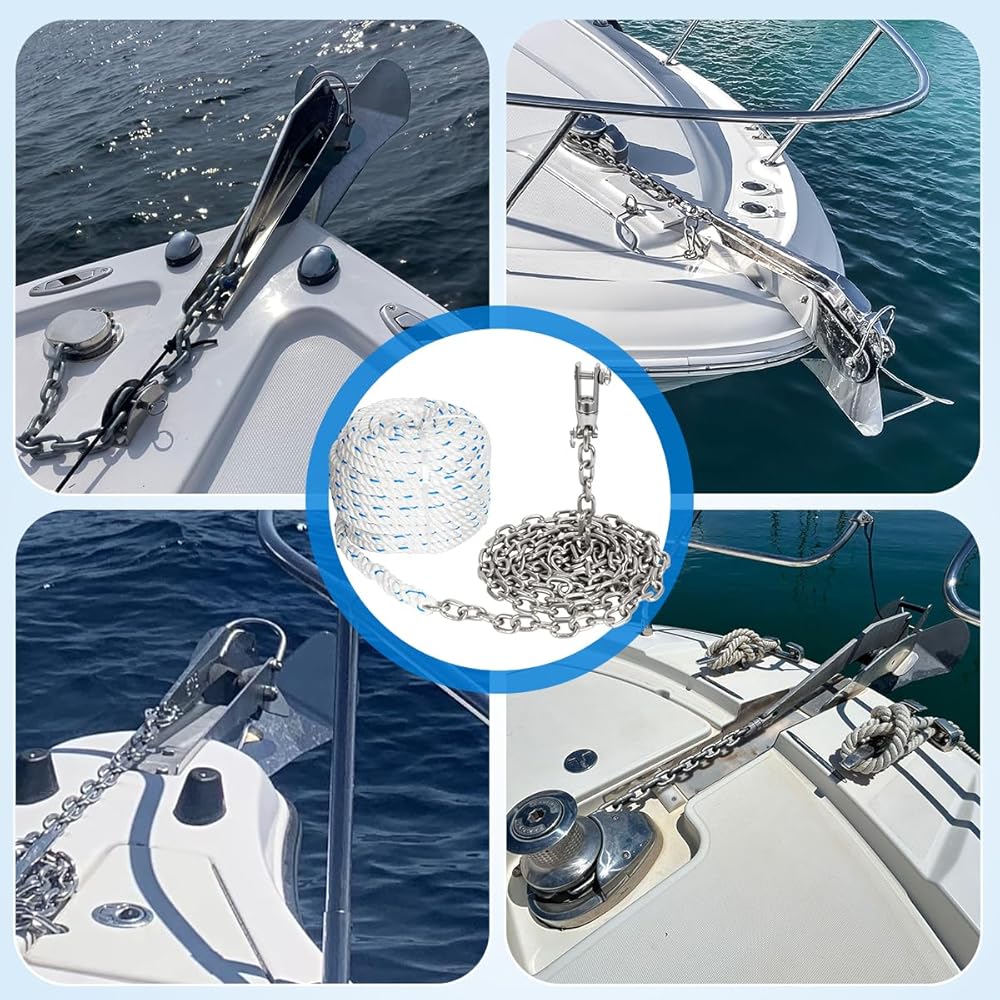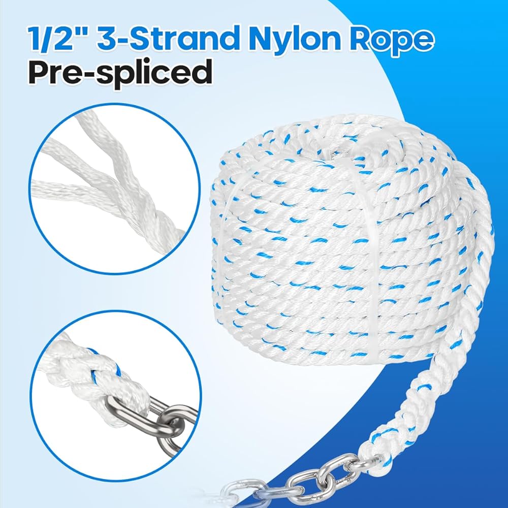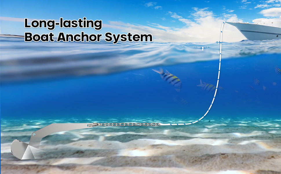 Long-lasting Boat Anchor System:3-strand nylon rope, HT G4 316 Stainless Steel chain, to guarantee optimum strength and life