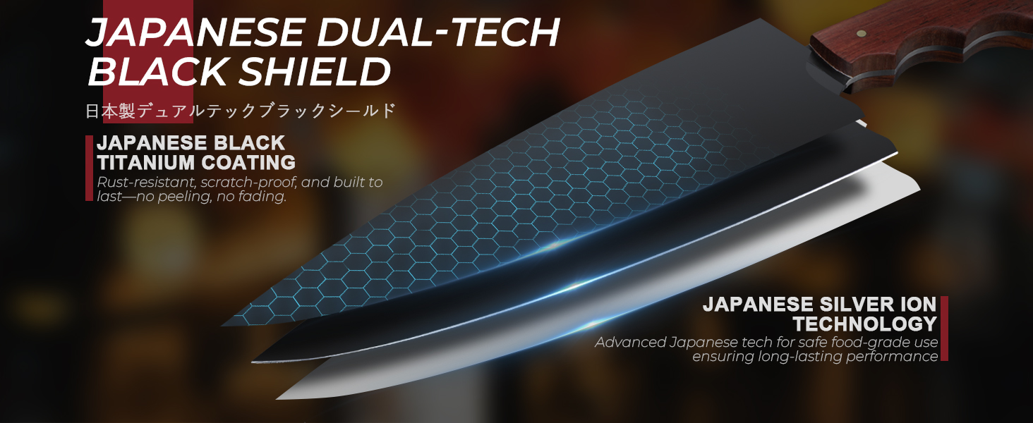 Dual-Tech Black Shield – Superior Coating Technology.This chef knife set features Japan's exclusive Dual-Tech Black Shield coating—a combination of refined silver-tone finishing and ultra-durable black titanium plating. The surface with a sleek matte finish that's easy to clean and built to last. Designed to perform under the rigors of daily kitchen use, it maintains its elegant appearance without peeling or fading over time.
