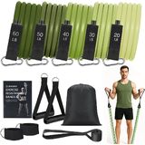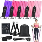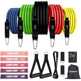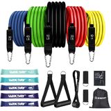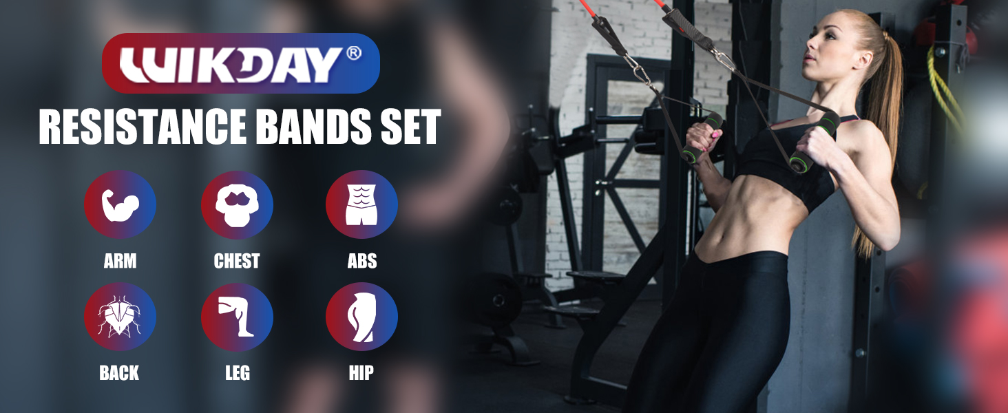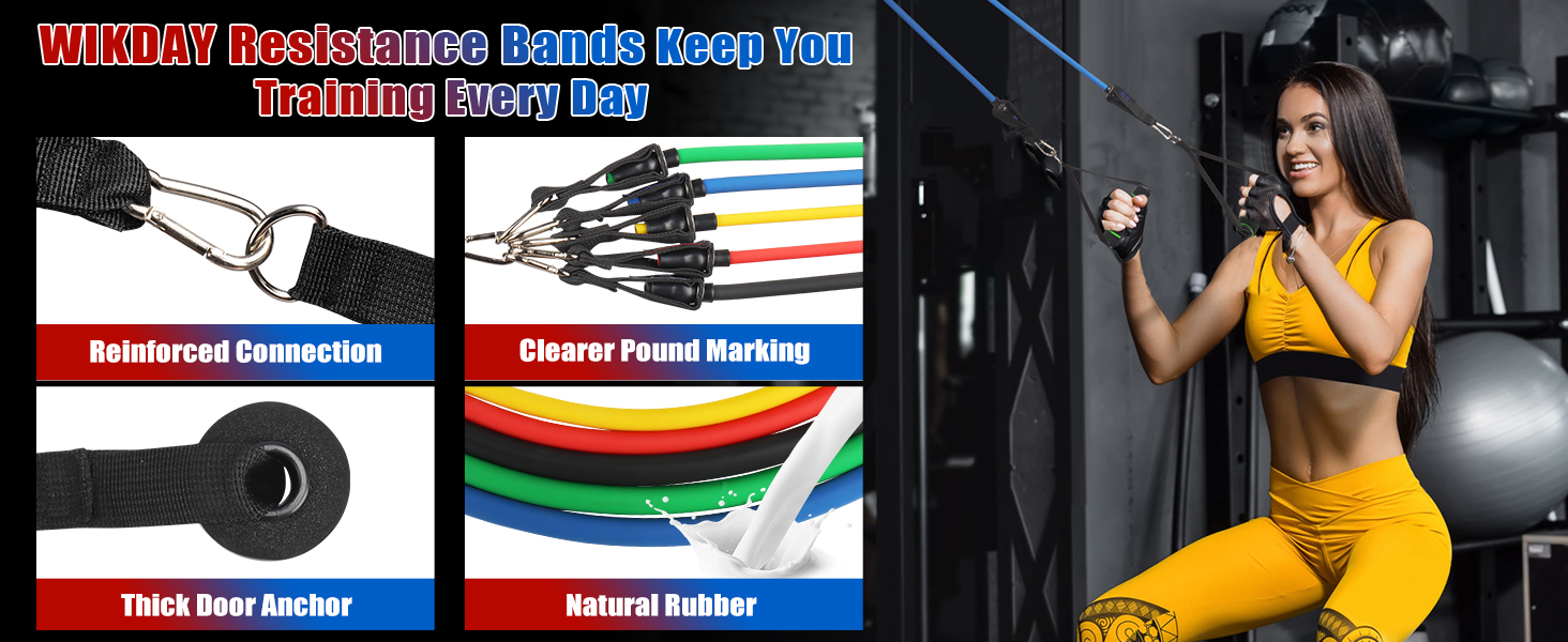 Adjustable Resistance Bands:WIKDAY professional resistance bands set with handles includes 5pcs resistance bands: Yellow (10 lbs), Red (20 lbs), Blue (30 lbs), Green (40 lbs), Black(50 lbs), all 47 inches long. They can be used individually or stacked for a total resistance range from 10 lbs to 150 lbs, making them versatile strength training equipment suitable for beginners, fitness enthusiasts, athletes, and others seeking effective exercise gear