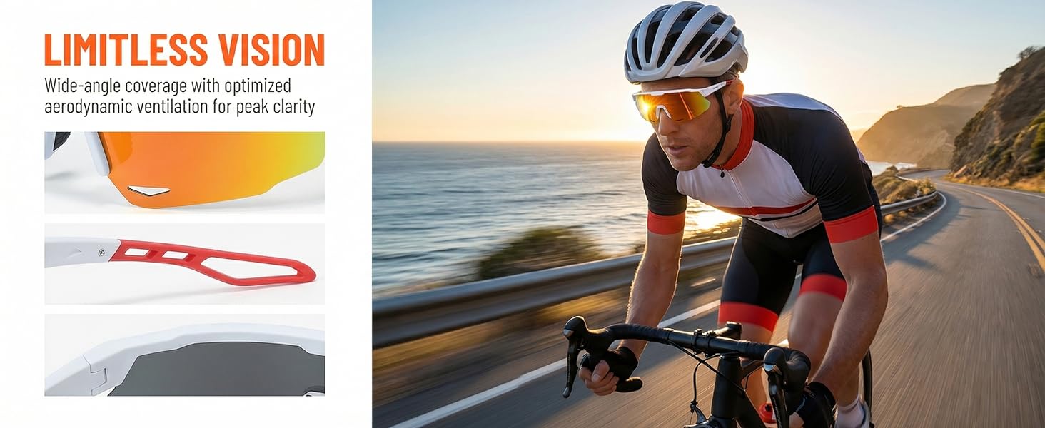 【Ultra Wide View】180° Wrap around and one-piece design, decided by fashion and practical. Provides a wide view, completely protects your eyes from injury, dust and wind well. The lens has UV400 anti UV protection function, scratch resistance, impact resistance, and the surface is easy to clean (anti oil coating). Simply wipe it with a professional cloth to maintain clarity.