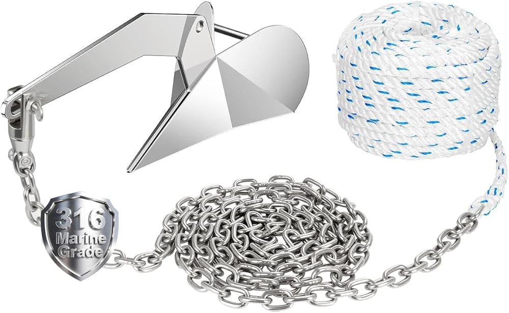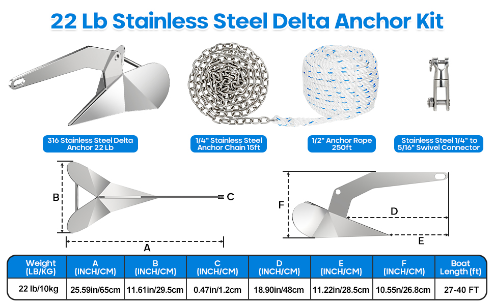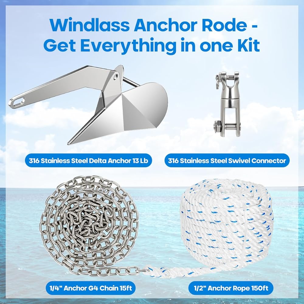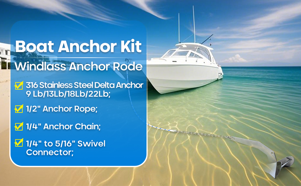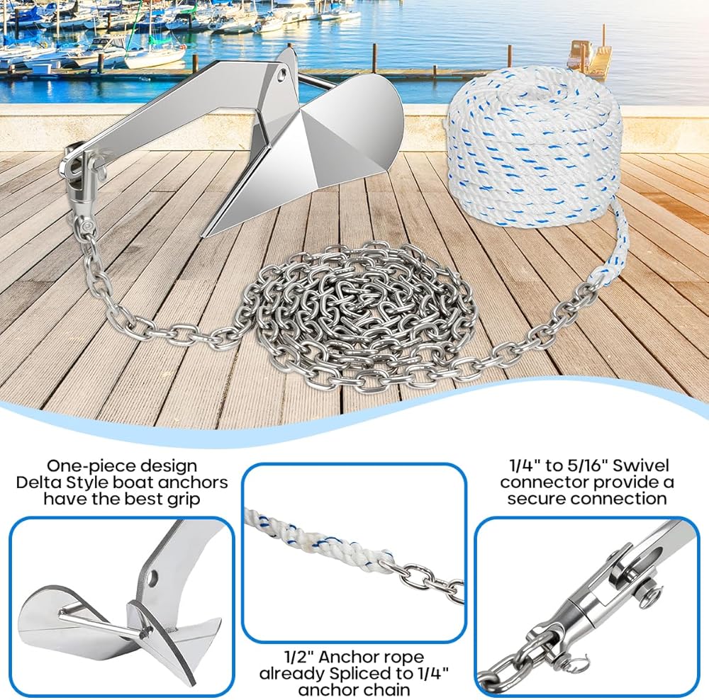 محتويات حزمة مجموعة مرساة القارب: مرساة دلتا من الفولاذ المقاوم للصدأ 316 13 رطل / 6 كجم؛ 1/2 "حبل مرساة 150 قدم؛ 1/4" 316 سلسلة مرساة من الفولاذ المقاوم للصدأ 15 قدم؛ قسمين 316 من الفولاذ المقاوم للصدأ من الدرجة البحرية سلسلة مرساة دوارة