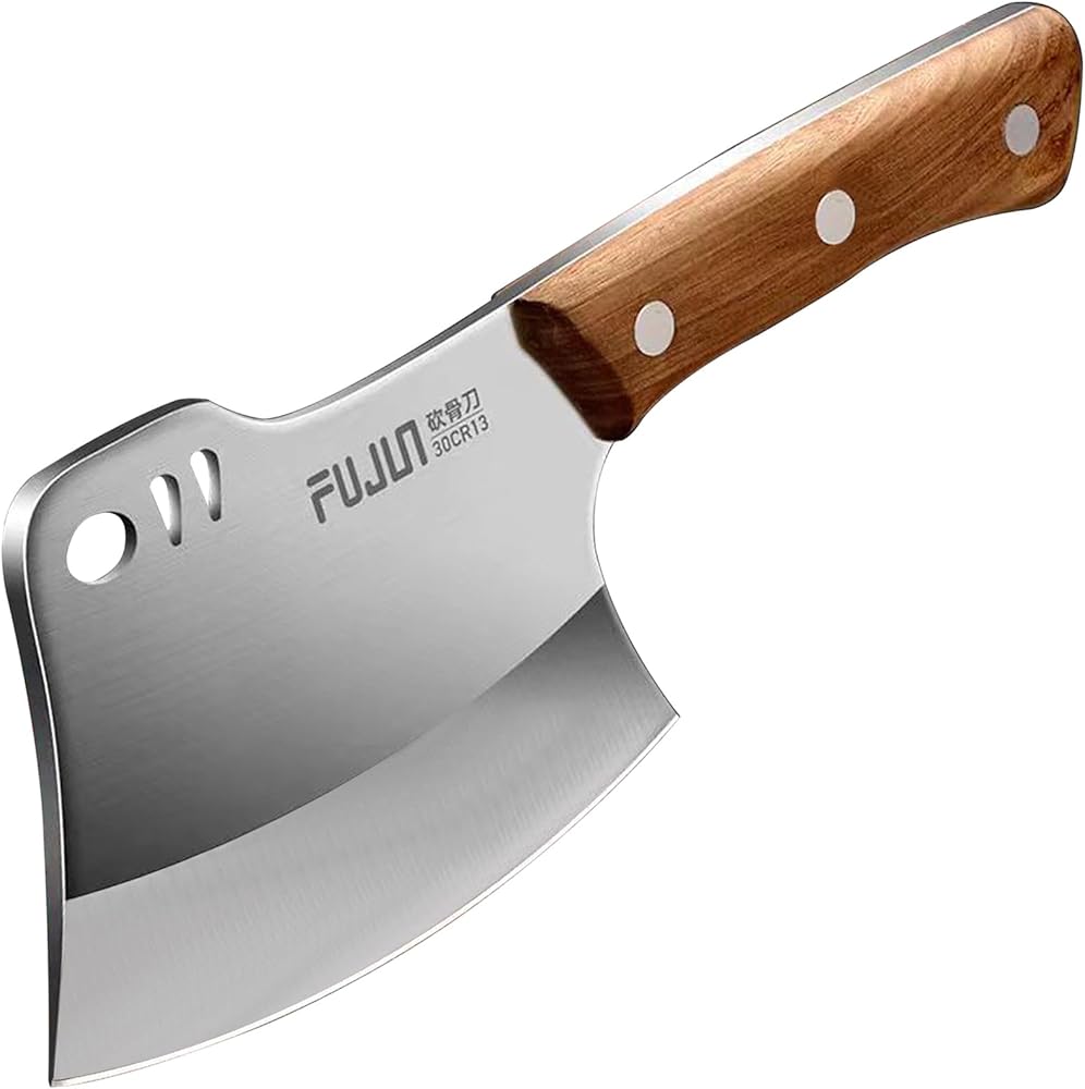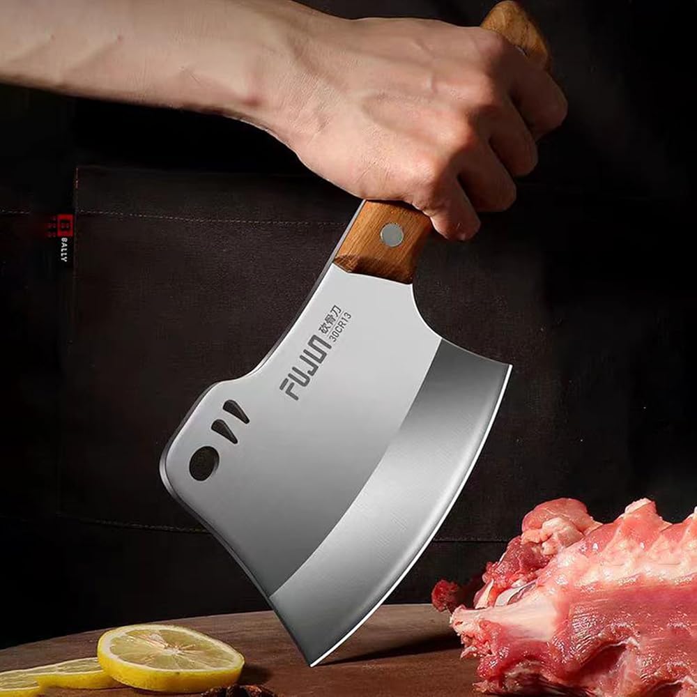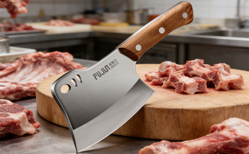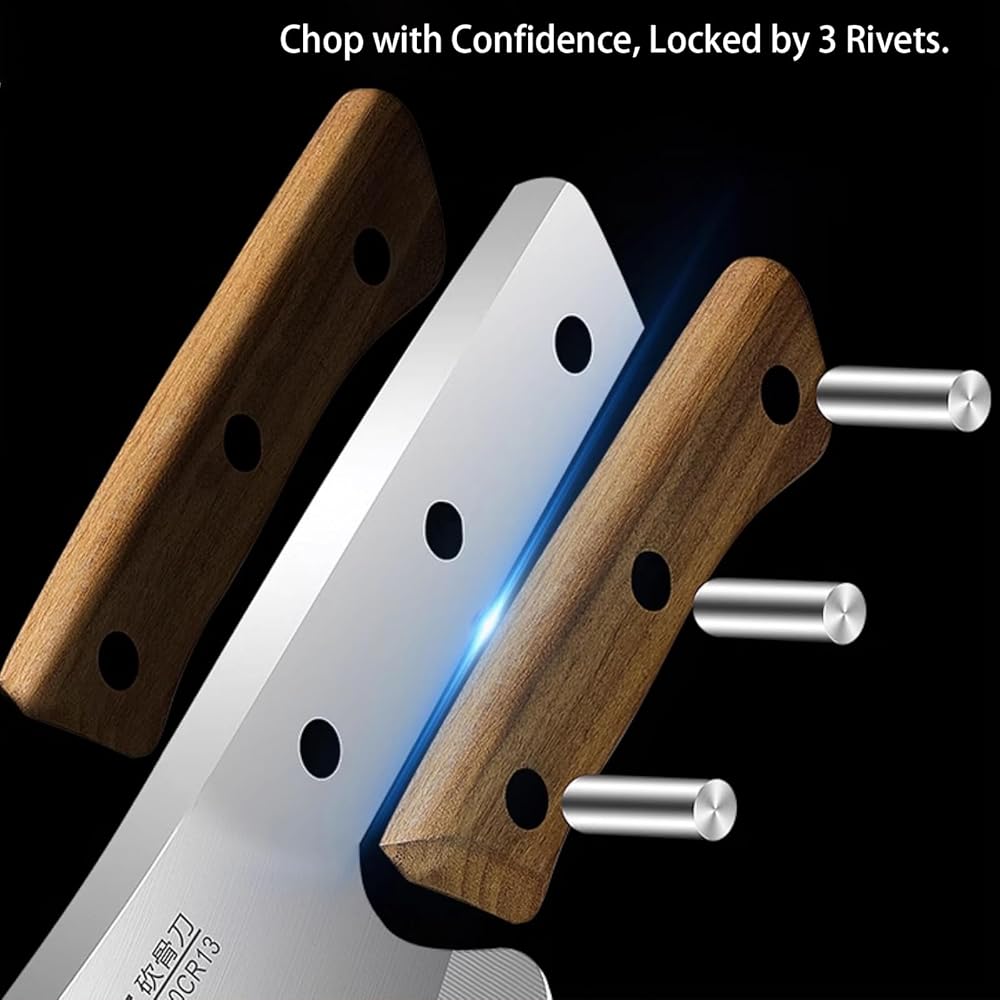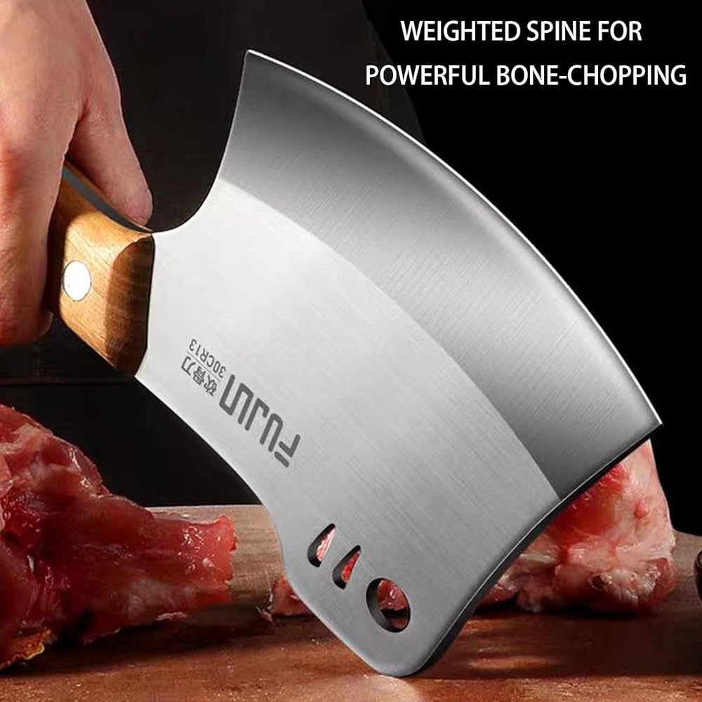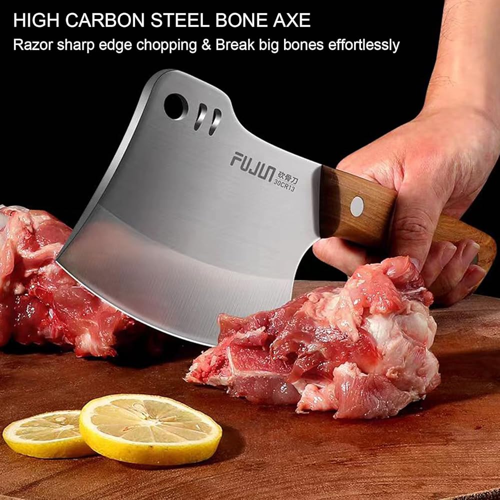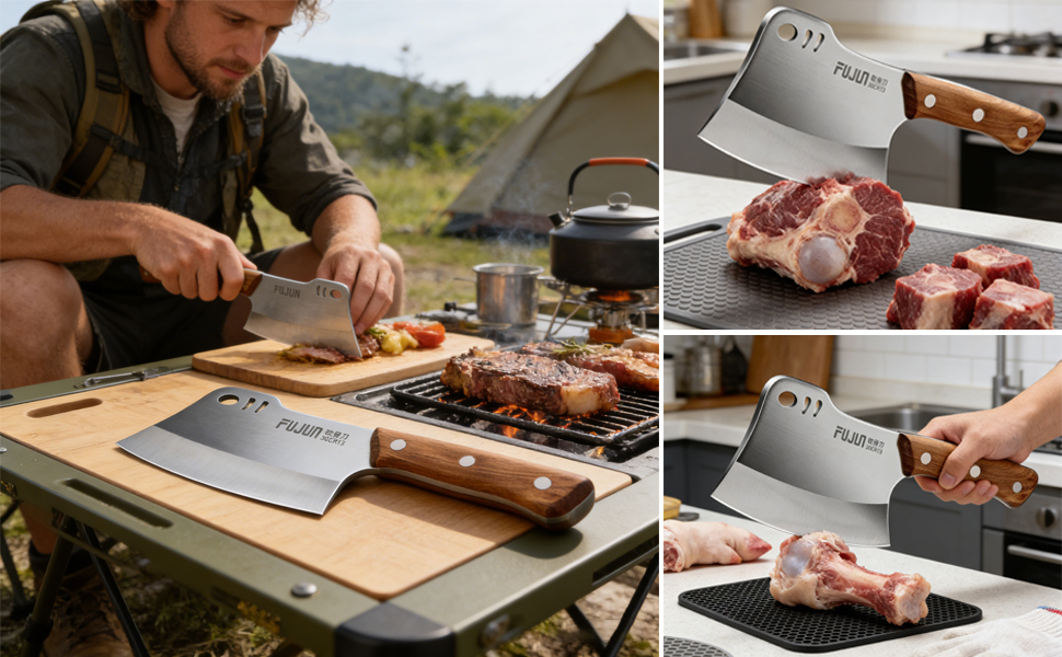 • 【فأس مطبخ متعدد الاستخدامات】سكين ساطور عظم اللحم هذا ذو وجهين. إنها شديدة التحمل بما فيه الكفاية لتقطيع اللحوم القاسية، وتقطيع الأضلاع، والدجاج، والديك الرومي، وعظم الأغنام، وعظم البقر، وعظم الخنزير، والأطعمة المجمدة، والخشب وما إلى ذلك. يعمل الجانب الخلفي كأداة حادة لتكسير العظام الصلبة بسهولة. ستكون قاطعة عظم اللحم هذه رفيقك المثالي في المطبخ أو أثناء التنزه سيرًا على الأقدام أو أثناء رحلات التخييم.