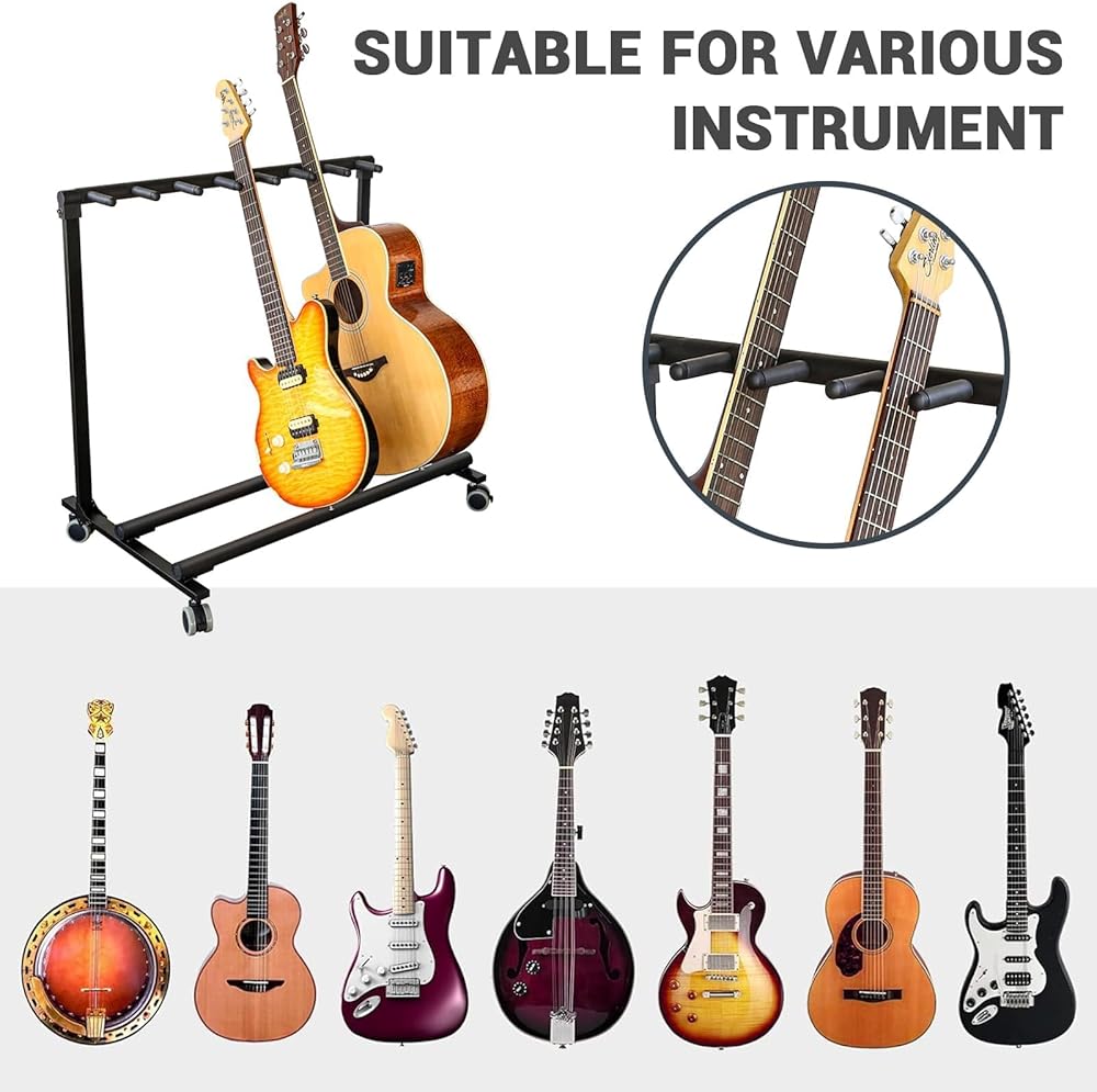 حامل حامل جيتار متعدد من CuisinSmart مع عجلات و7 حوامل حامل جيتار قابل للطي رف عرض مع تخزين حشوة مطاطية مانعة للانزلاق للمنزل الفرقة المرحلة باس استوديو كهربائي صوتي استخدام أسود