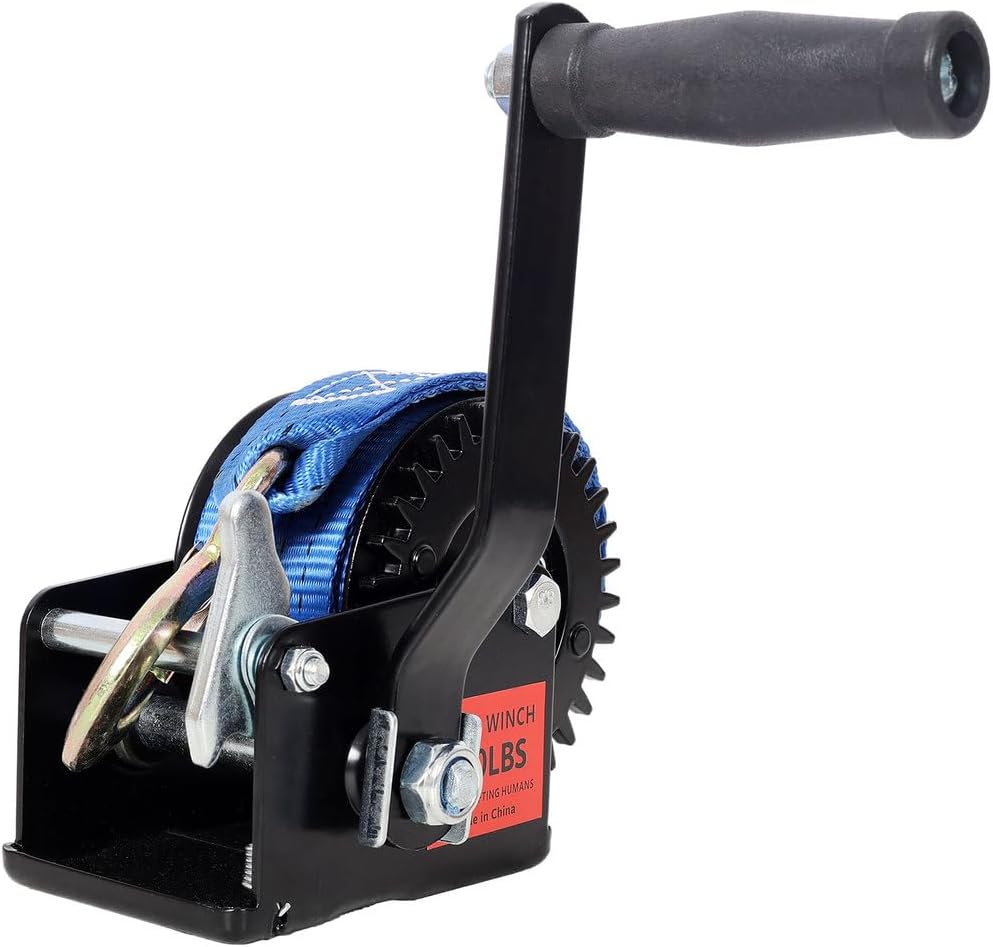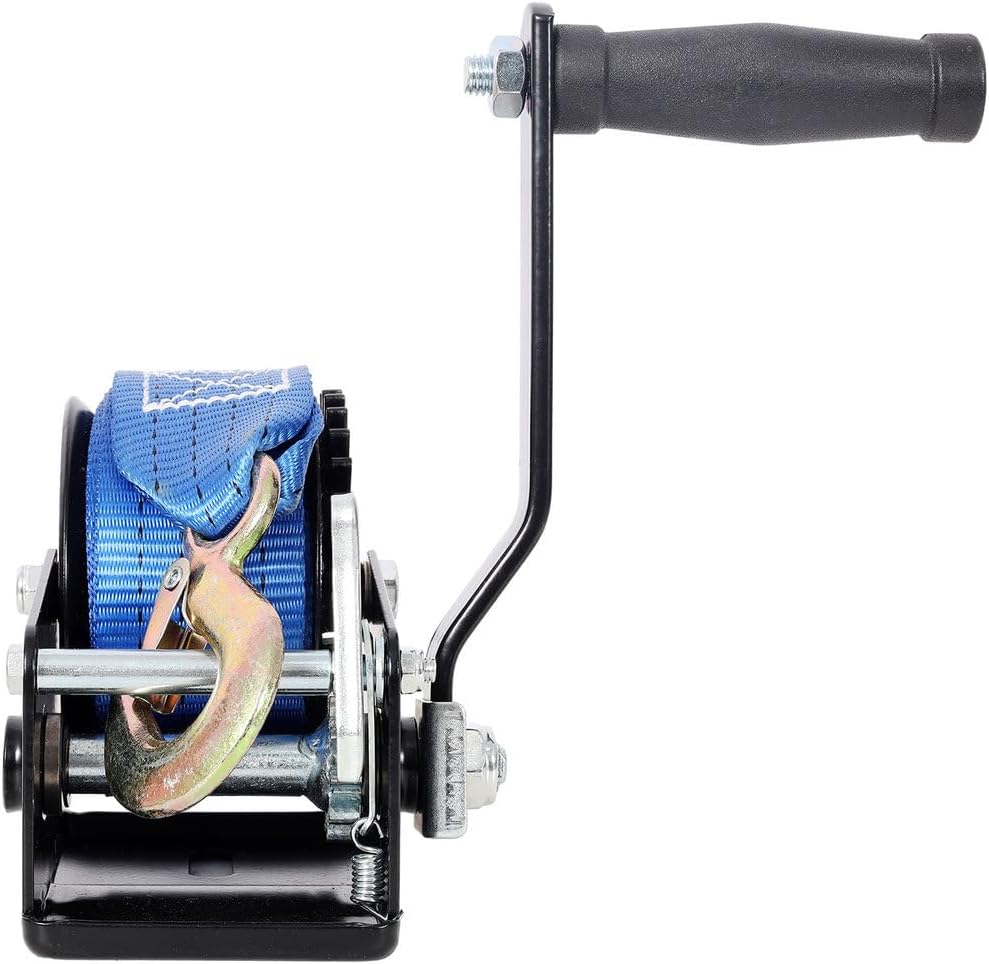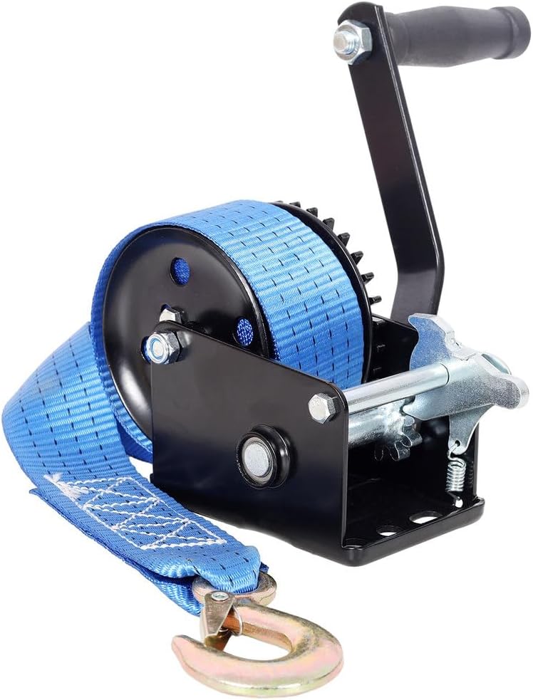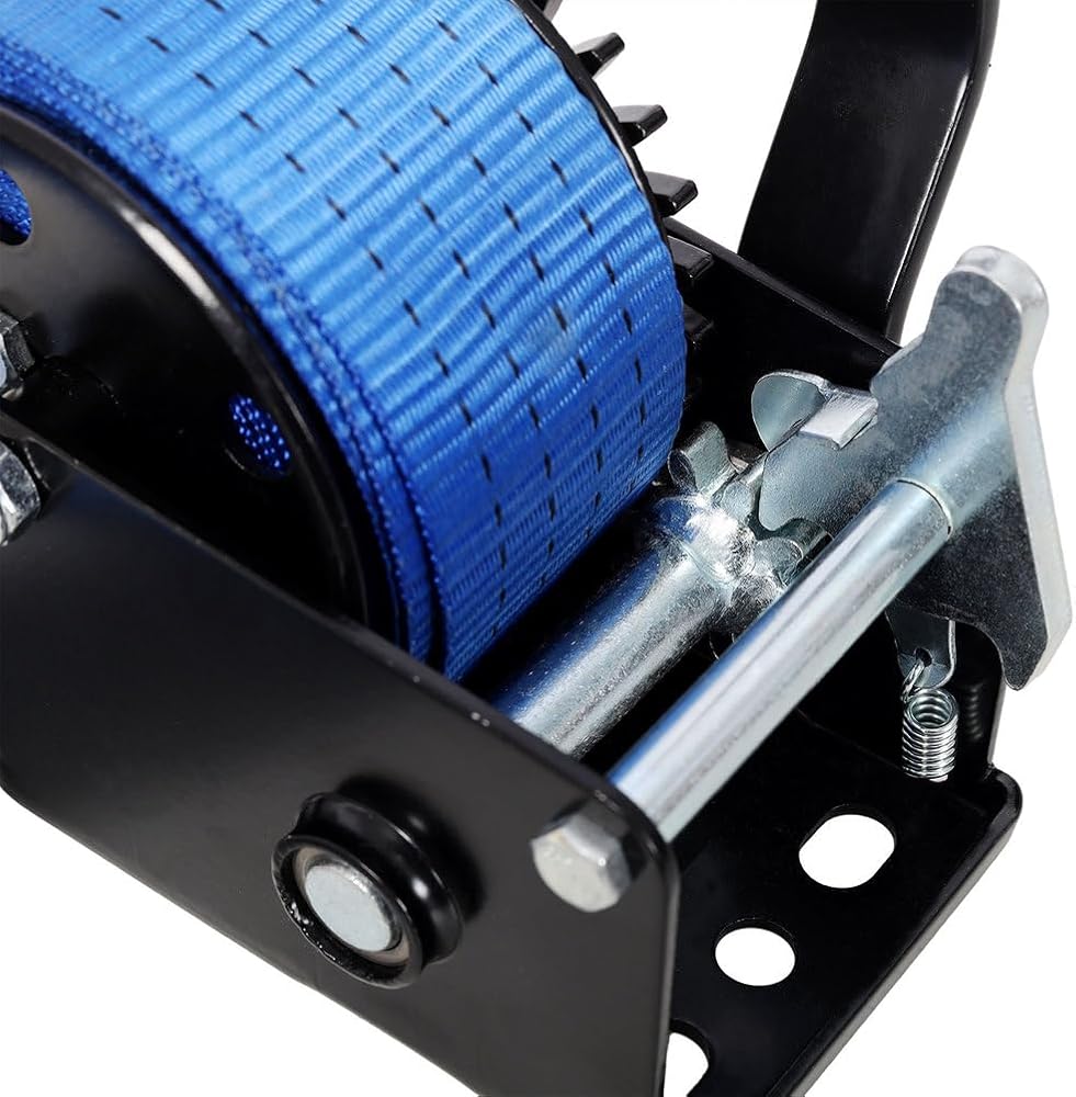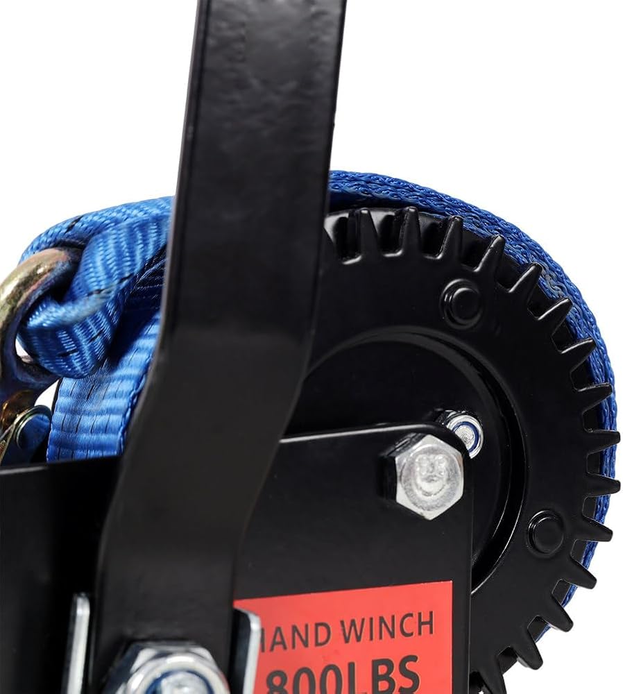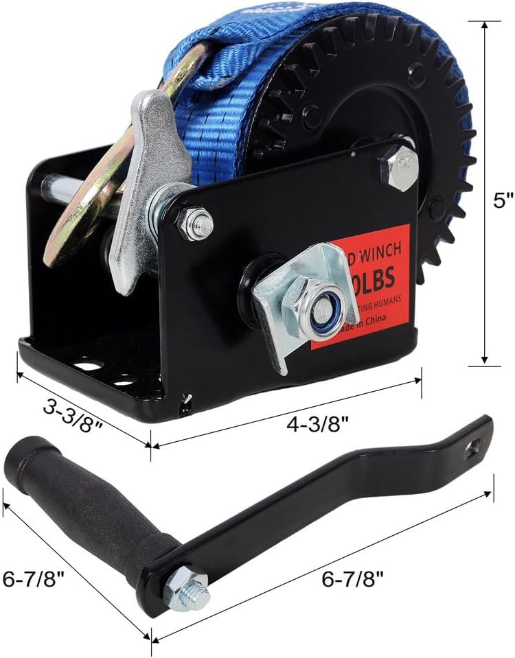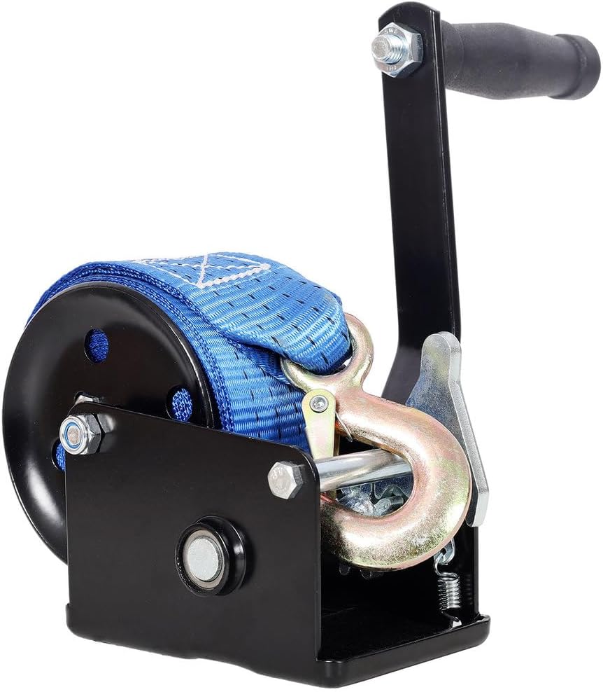 19.6 ft High-Strength Strap with Hook (Strap Winch): Includes a 19.6 ft heavy-duty winch strap with hook, offering strong tensile strength and flexibility for secure connections. Ideal for users needing a strap hand winch for boats, ATVs, and utility trailers.