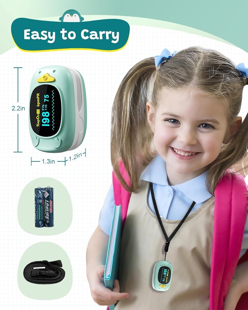 محمول وقائمة: مقياس التأكسج النبضي للأطفال صغير الحجم، ويزن 55 جرامًا، ويحتوي على حبل، حتى تتمكن من حمله معك حتى عند الخروج أو السفر. تأتي العبوة مع طرف إصبع واحد لمراقبة الأكسجين ودليل مستخدم واحد وبطاريتين AAA.