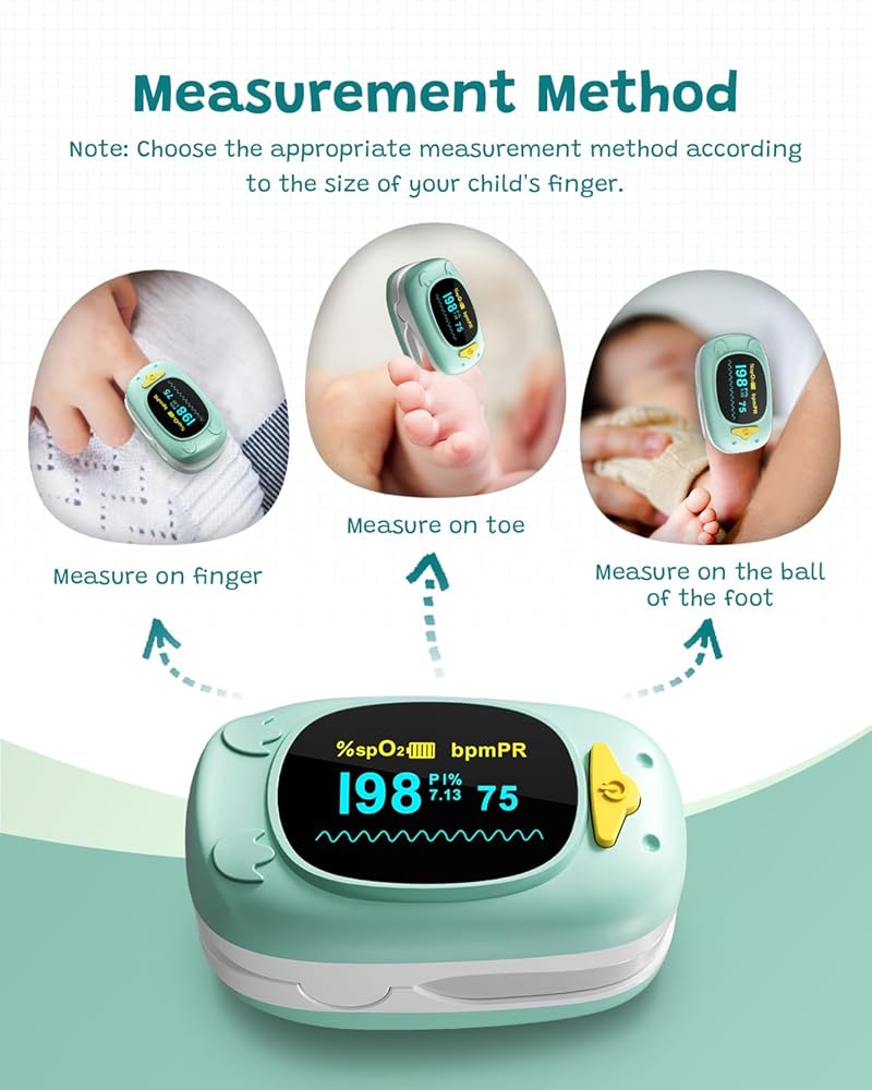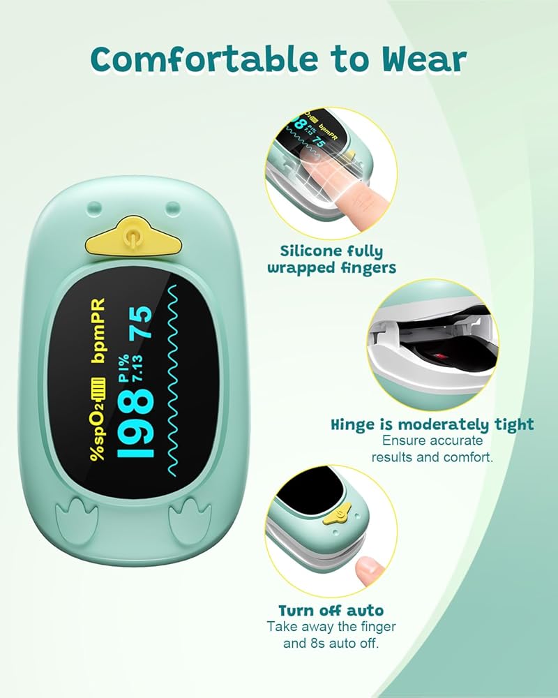 مصممة للأطفال: تم تصميم معرفات مقياس التأكسج بنبض الإصبع للأطفال، بحجم خاص يناسب الإصبع الصغير للطفل. يمكن لأطراف أصابع مقياس التأكسج النبضي قياس الأكسجين في الدم ومعدل ضربات القلب وPI في نفس الوقت. ملحوظة: غير مناسب للأطفال أقل من عامين.