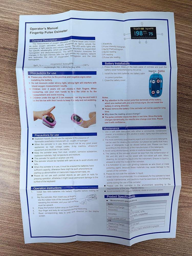 جاهز للاستخدام خارج الصندوق: يأتي مقياس التأكسج النبضي المحمول للأطفال مع بطاريتين، ويمكنك استخدامه على الفور. ملحوظة: عند تركيب البطارية، تأكد من التحقق من العلامات الإيجابية والسلبية في فتحة البطارية أولاً لتجنب أخطاء التثبيت.