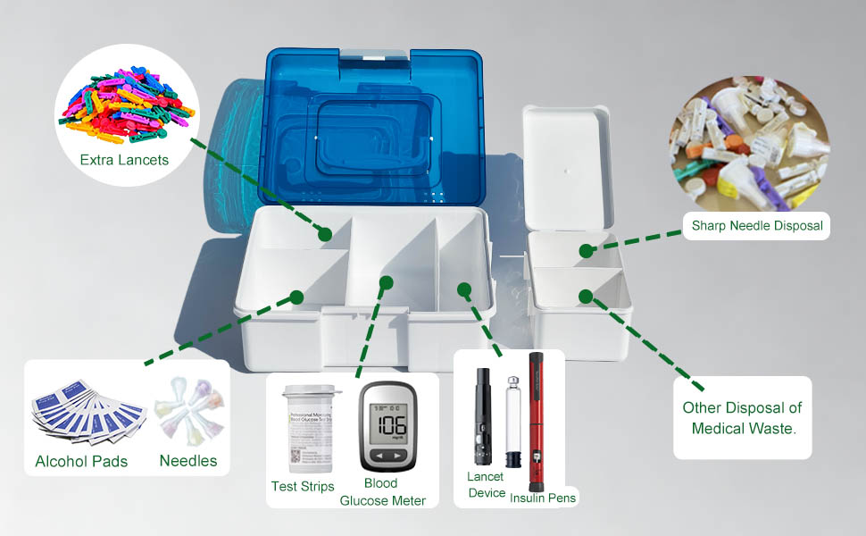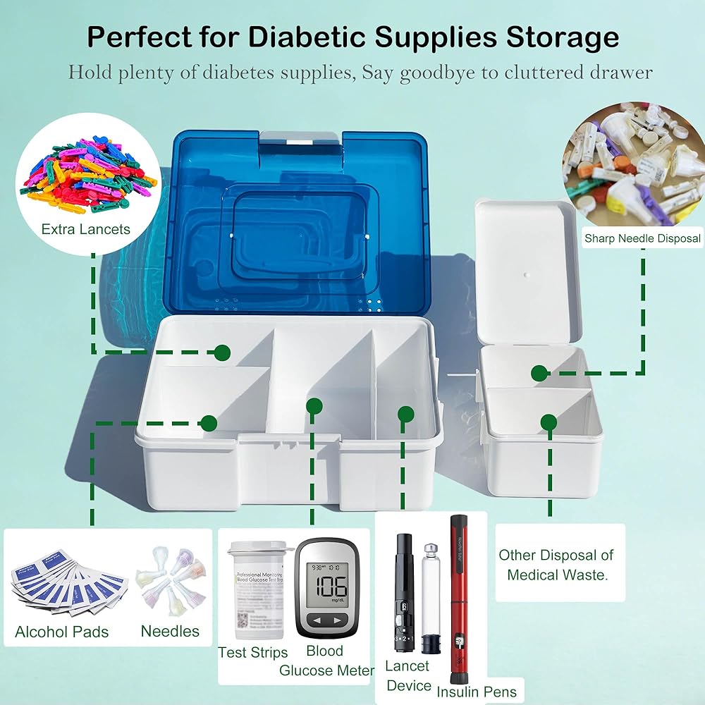 【سعة كبيرة】الجزء الداخلي الواسع لمنظم مستلزمات مرض السكري هذا يمكن أن يتوافق مع معظم أنواع أجهزة قياس السكر في الدم. بالإضافة إلى ذلك، تتضمن علبة جهاز قياس السكر هذه حاوية للأدوات الحادة قابلة للإزالة مع فواصل مدمجة لتخزين المشارط المستخدمة والنفايات الطبية.