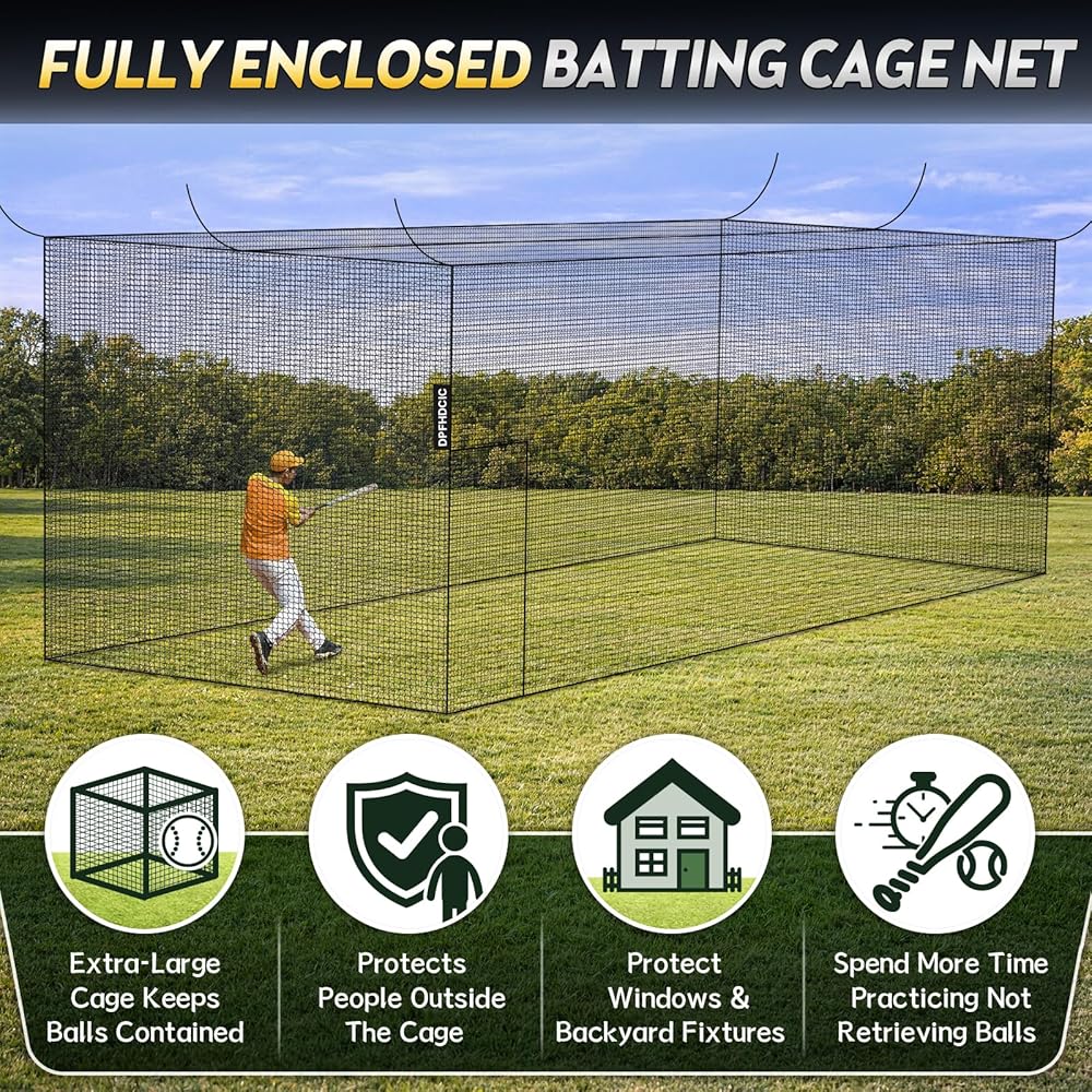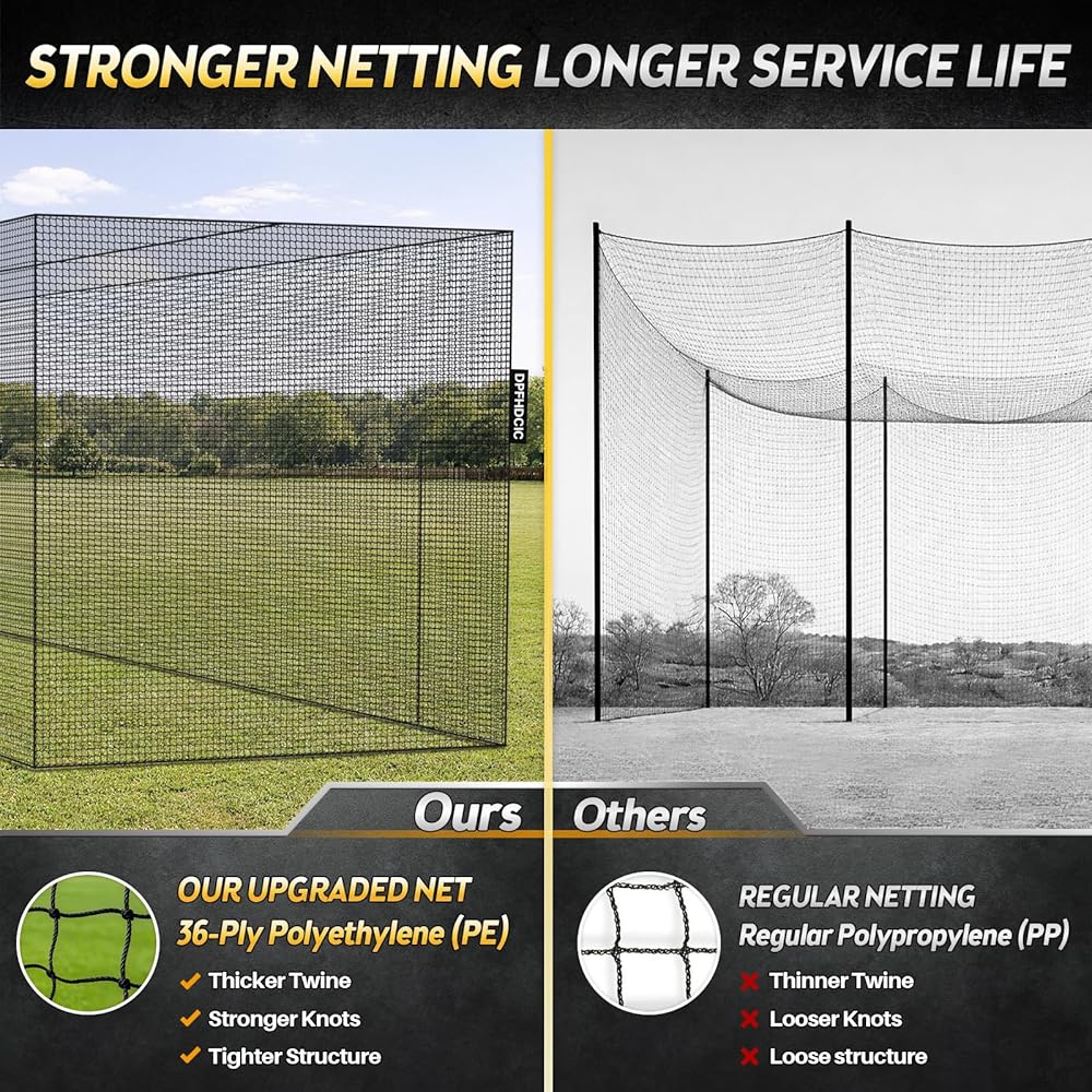 36 Weather-Resistant PE Material: The batting cage net is crafted from professional-grade #36 ply high-density polyethylene (HDPE) to withstand high-velocity impacts from baseballs and softballs. The UV-stabilized mesh is built for year-round durability in all weather, making it ideal for both backyard and indoor use