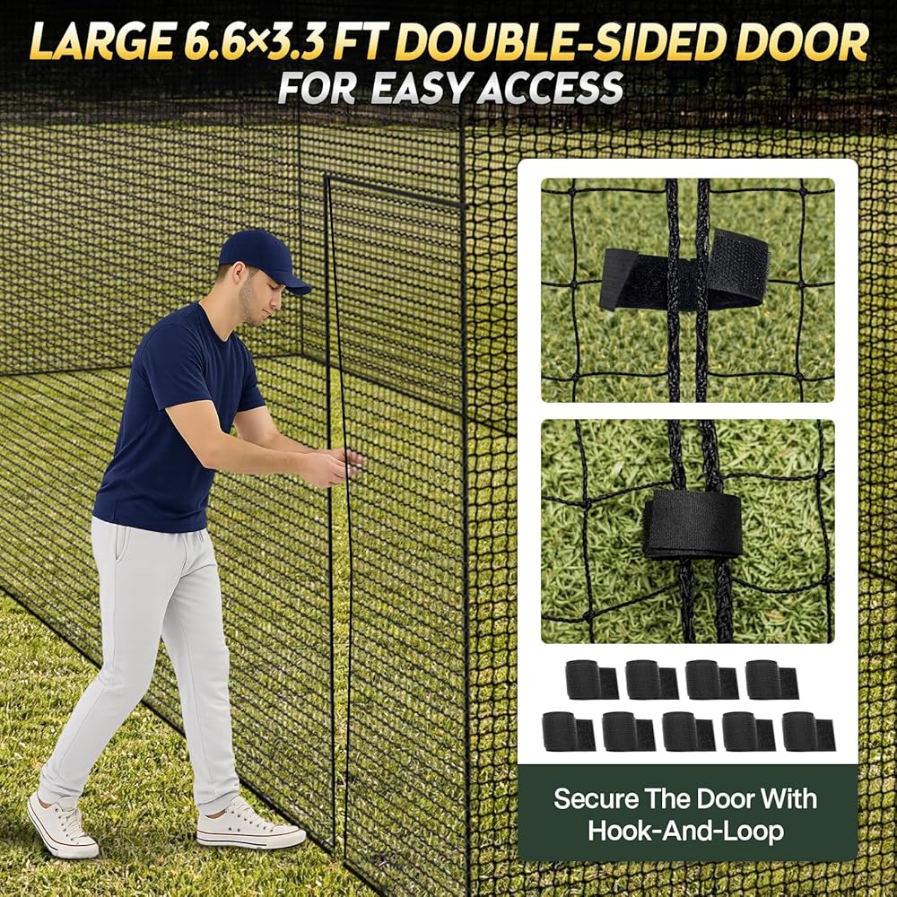 Convenient Door for Easy Access: The baseball cage net is designed with a 6.6 ft x 3.3 ft entrance door for smooth entry and exit without lifting the entire net. The hook-and-loop door opens and closes easily, saving time while helping keep the entrance securely sealed