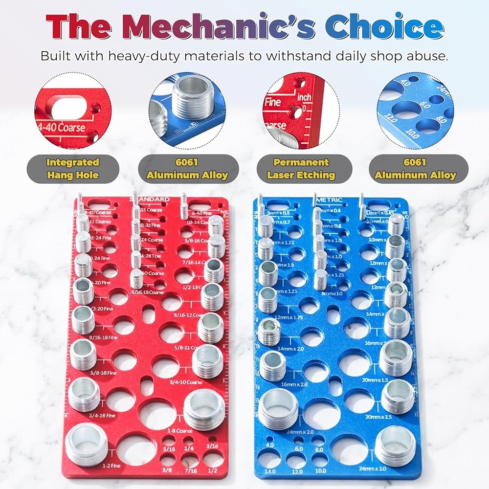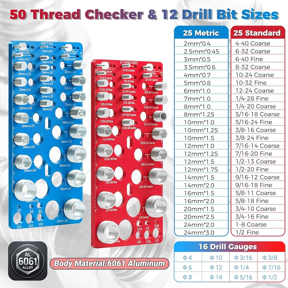 MASSIVE 62-PIECE SYSTEM - MOST COMPLETE COVERAGE ON THE MARKET Stop struggling with standard 26-piece sets that miss common sizes. Our upgraded kit features 25 Metric and 25 Standard (Inch) thread gauges, plus 12 integrated Drill Bit sizers. From tiny M2 precision screws to heavy-duty M24 bolts, you will finally have a dedicated checker for virtually every fastener in your shop. No more guessing or forcing the wrong nut onto a bolt.
