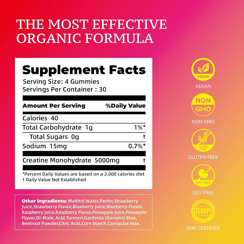 [Premium Formula,Maximum Efficacy]: Our Creatine monohydrate gummies contains 5g=4 gummies pure creatine monohydrate per serving combined for Maximum Benefits.