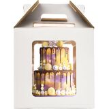 Present your stunning layer cakes with confidence in this spacious 12 x 12 x 12 inch white bakery box. The thoughtfully designed window allows you to showcase your beautiful creations while keeping them protected during transport or storage. Perfect for tiered cakes, large celebration cakes, or multiple smaller treats, this durable cake carrier provides ample height to accommodate tall masterpieces. The sturdy construction helps maintain the integrity of your delicate desserts, while the clean white exterior gives a professional presentation. Whether you're a home baker or running a bakery business, this generously sized cake box offers the ideal solution for safely storing and transporting your precious confections. The box arrives ready to use and is an essential tool for anyone who creates tall or tiered cakes.