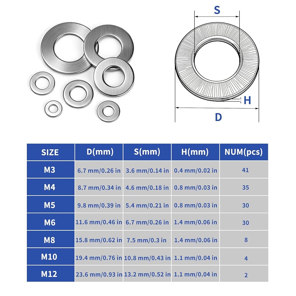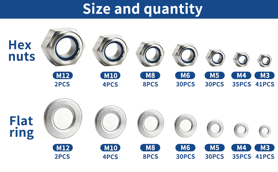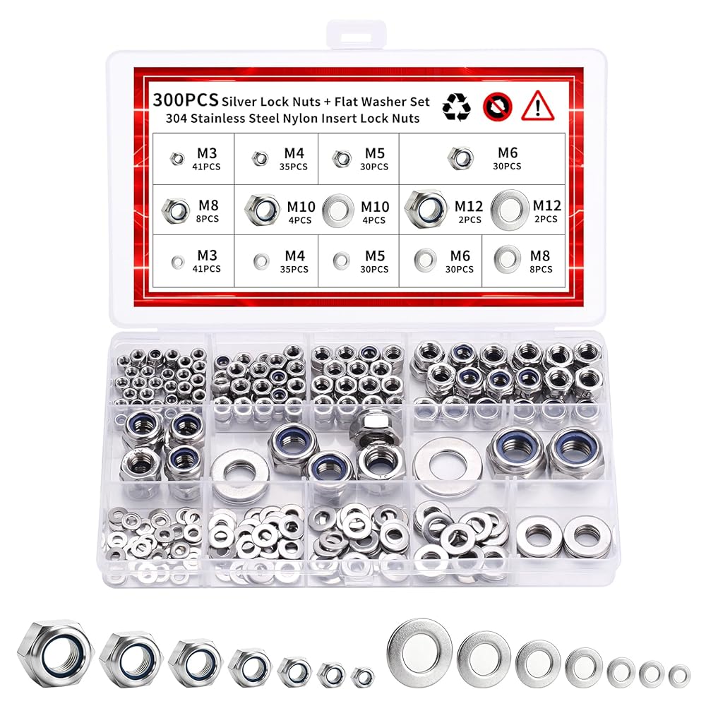 300 قطعة من صواميل الأجهزة والغسالات المعدنية للبراغي: 150 صواميل قفل مترية متنوعة مع 150 غسالات مسطحة من الفولاذ المقاوم للصدأ مجموعة متنوعة من الغسالات للبراغي (M3 M4 M5 M6 M8 M10 M12)