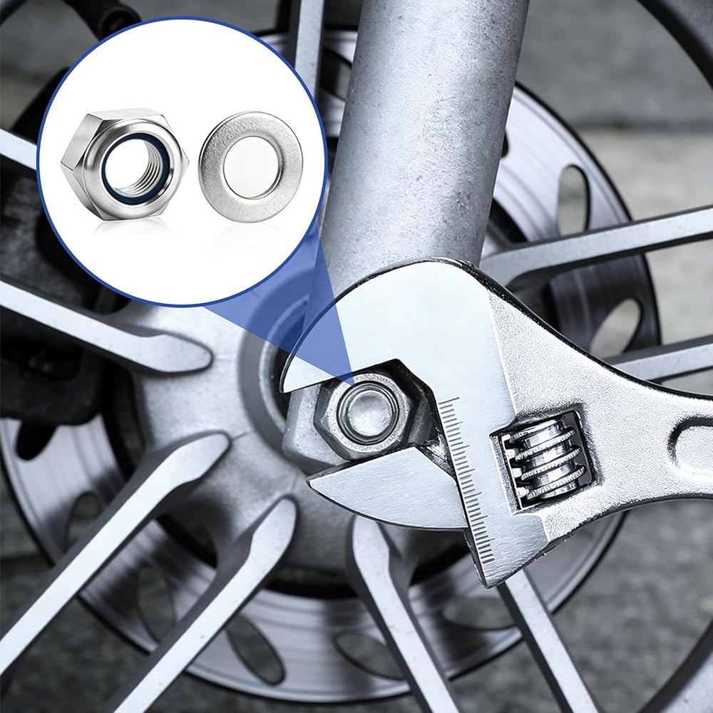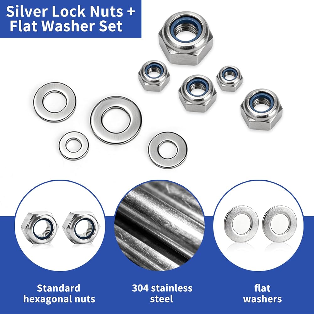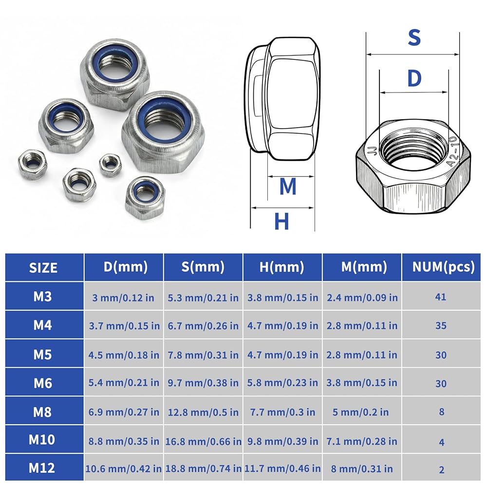 مجموعة صواميل سداسية: قفل صواميل ربط وتأمين الأجزاء. إنها تمنع تعرض الترباس وحركة الترباس العرضية أو الارتخاء. تضمن حشوات النايلون تثبيتًا آمنًا وأمانًا وثباتًا أفضل.